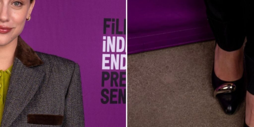 Lili Reinhart Gives Gray Tailoring a Sculptural Twist With Tory Burch’s Pierced Black Pumps