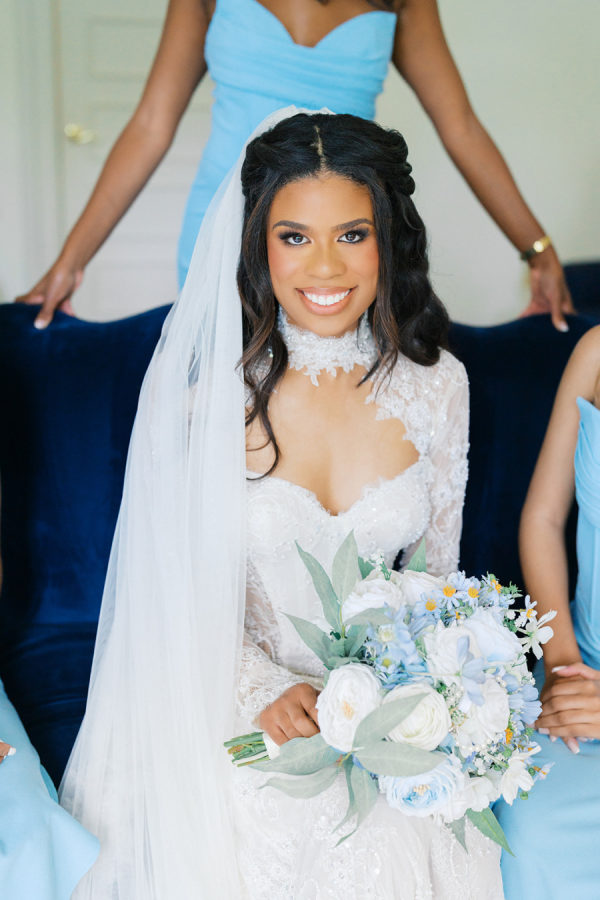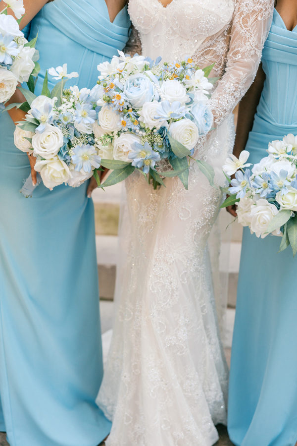 Our colors were baby blue, white, and gold — a combination that felt timeless yet fresh. We loved the richness and depth of blue paired with the classic elegance of gold. These tones carried through our florals, linens, and reception decor for a cohesive, elevated look.