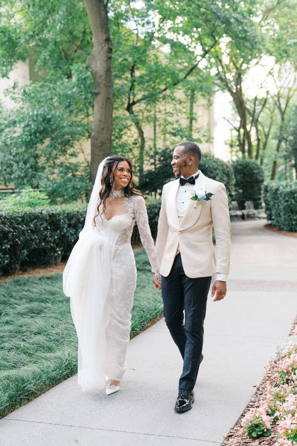 We wanted our wedding to feel elegant and romantic with a sophisticated modern touch. Our goal was to create a welcoming, up-tempo atmosphere — where guests could feel both classy and comfortable enough to mix, mingle, and truly enjoy themselves. Every detail was designed to balance refinement with warmth, giving the day an effortlessly elevated feel. We wanted the reception at The Wimbish House to feel like a modern theater — simple, elegant, and grand. The design featured crisp white and gold details, monogrammed napkins and cups, and soft uplighting that added warmth and depth to the space. The result was a celebration that felt both timeless and lively — perfectly suited to our vision of refined joy.