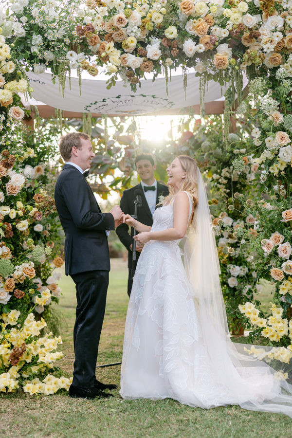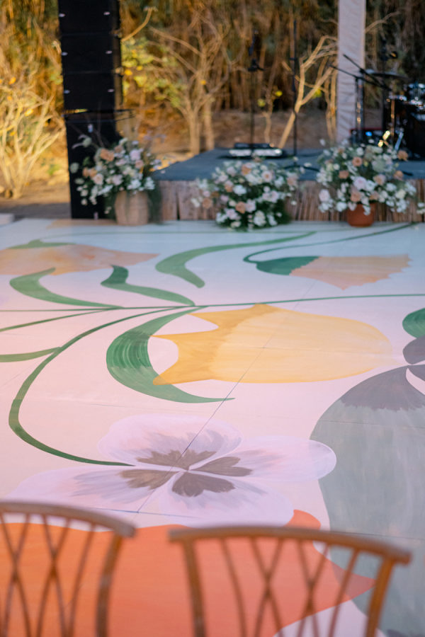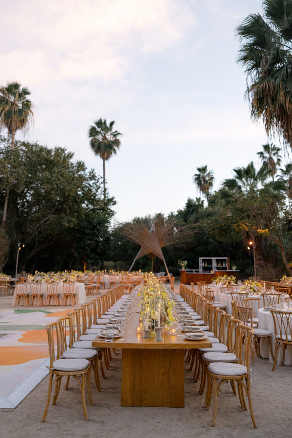 Cassidy and Hugo’s wedding décor was a true reflection of their personalities—warm, vibrant, and deeply meaningful. The ceremony took place beneath a stunning huppah adorned with lush, Baja-inspired florals in shades of yellow, peach, and earthy tones, a palette that harmonized beautifully with the natural charm of Puerto Raíz. To make it even more personal, Cassidy’s father’s Thali was thoughtfully incorporated into the design, adding a heartfelt and unique touch. For the reception, we embraced the venue’s organic spirit by arranging 225 chairs in an intentionally uneven layout, creating a relaxed and natural flow. The celebration continued with a mix of round and rectangular tables, including an impressive bridal party table for 35 guests that became the centerpiece of the evening. The dance floor, designed in collaboration with The Floor Is Yours, echoed the wedding’s warm color palette, tying the entire design together while inviting guests to celebrate in a space that felt distinctly Cassidy and Hugo.