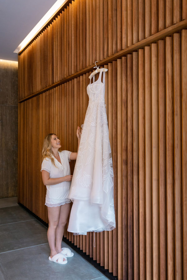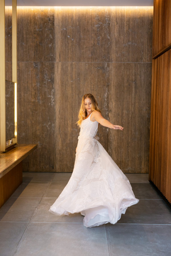 Cassidy found her dress when shopping in Chicago at Ultimate Bride with her mom and sister, who was getting married 6 months after Cassidy and Hugo,o so they shopped for dresses together!. Cassidy couldn’t stop thinking about one dress in particular, so a few months later, she went to see it again in New York at Berta’s flagship store with a few of her best friends. They were in the store for all of ten minutes — She tried it on, and everyone instantly agreed it was the one. This gown was the perfect blend of modern elegance and romantic charm. Crafted with delicate floral appliqué over soft layers of sheer fabric, it created a light and ethereal movement with every step. The structured bodice offered a flattering silhouette, while the flowing skirt added a sense of effortless grace. Both timeless and contemporary, it was a dress that felt just as dreamy twirling in a sunlit room as it did walking down the aisle.