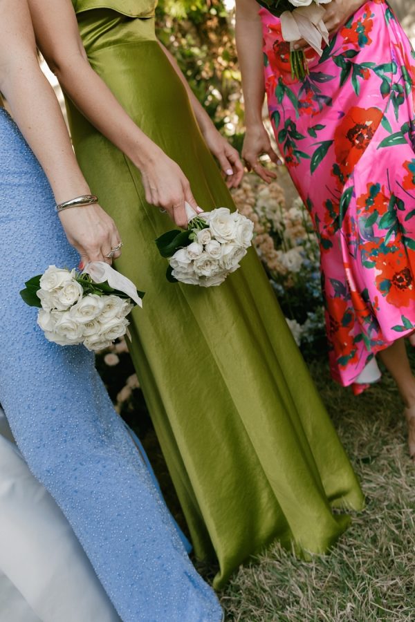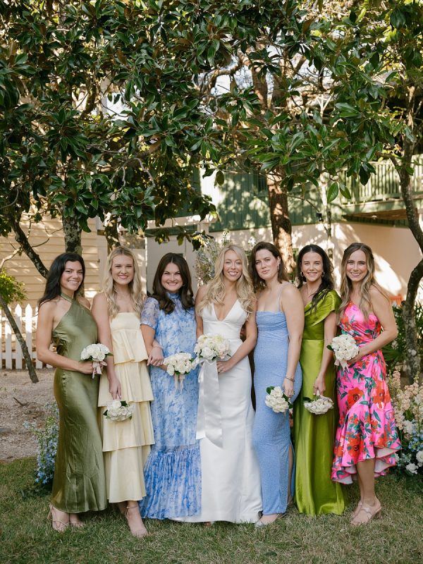 [field title=”Bridesmaid Dresses”]The bride wanted her bridesmaids to feel like the best version of themselves, allowing them to choose any dress they loved as long as it was colorful. The result was a stunningly diverse mix of hues, textures, and silhouettes, from shimmering satin and soft ruffles to bold floral prints and delicate lace. Each dress reflected the personality and style of the woman wearing it, creating a vibrant yet cohesive look. The mix of pastels, jewel tones, and statement prints captured the joy and individuality of the day, proving that mismatched dresses can be just as breathtaking as a traditional uniformed bridal party.[/field]