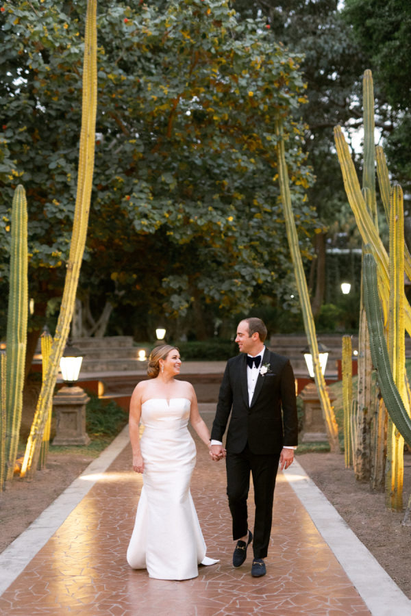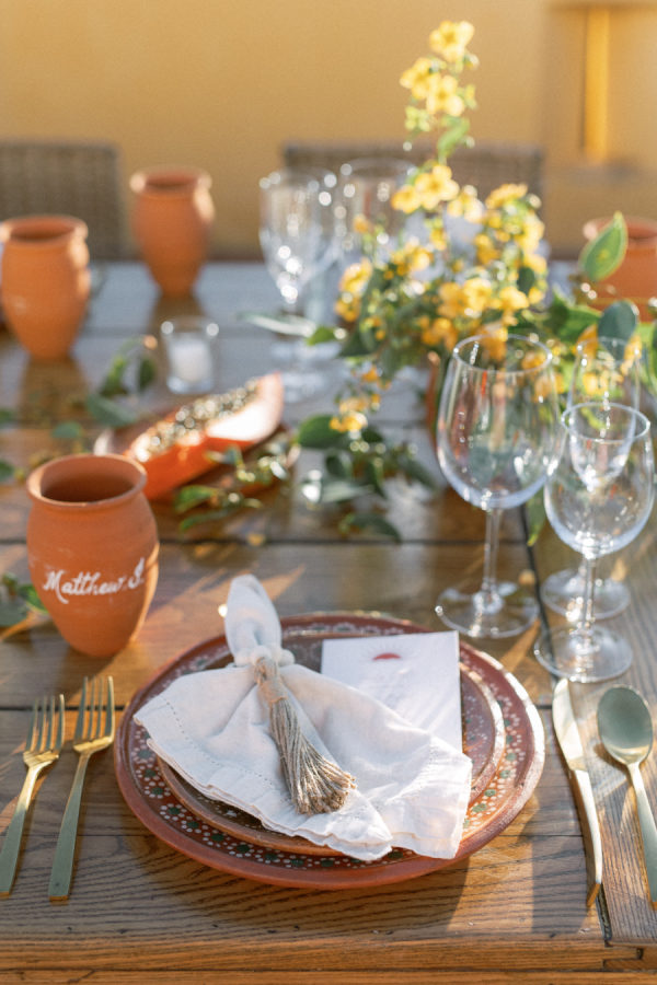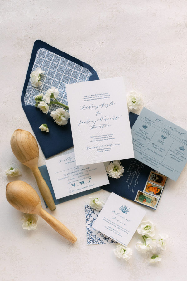 Their dance floor was hand-painted to match a piece of tile Lindsey found during one of their trips; it was the centerpiece of the reception as it was. The same tile pattern was featured on the bar and DJ booth. The lighting team created a truss structure over their dance floor, covered in greenery and vines and accentuated with rattan lanterns. The dining tables’ place settings featured woven rattan chargers beneath traditional blue and white talavera plates. The Little Postage House produced all of the printed items for the wedding. The main invitation card featured a blind imprint of an agave and a rich blue ink for the details. The deep blue envelopes featured tile pattern liners and vintage postage.