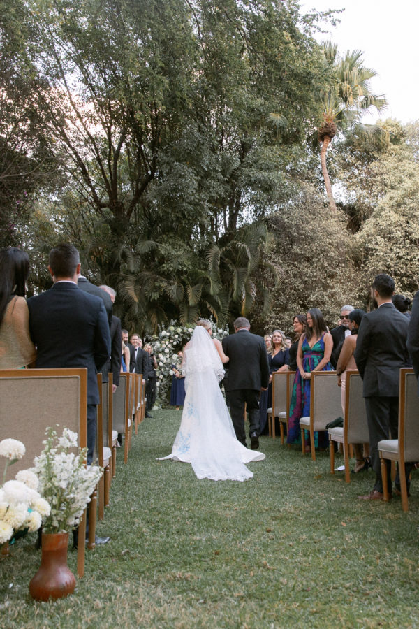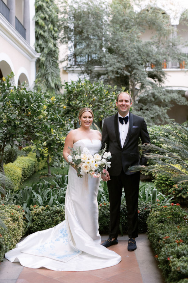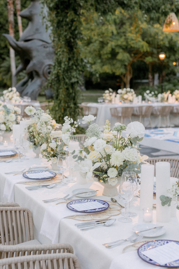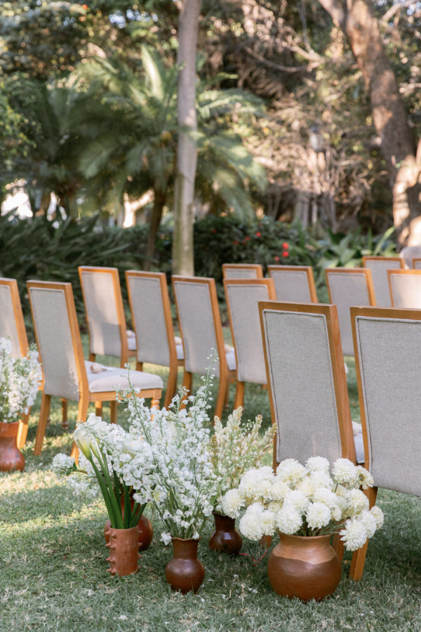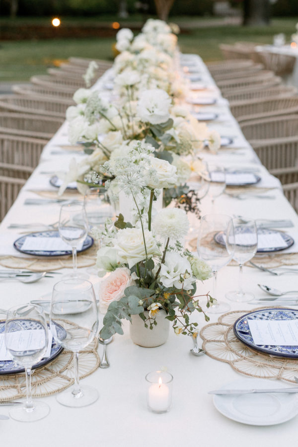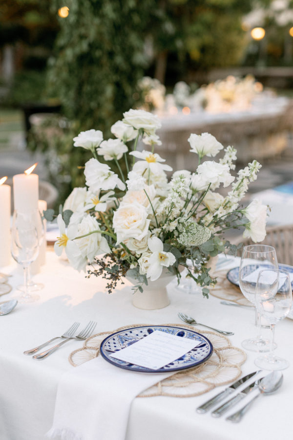 For florals, I kept saying I wanted them to feel organic and effortless. I wanted a neutral palette, so all the beautiful details of the china would be the star of the day. I worked with Floweriize to create the florals for our wedding day. She doesn’t use any floral foam, which I loved. I loved that we were able to do a little bit for Mother Earth on our wedding day. I asked for the flowers to be fragrant, white, soft, creamy blush, and green. I specifically asked for tuberose and gardenias as I love the scent and wanted the reception to smell delightful. Having planned a lot of events, I know how important it is for guests to be able to have conversations and be able to see over the flowers, so we did a lot of smaller satellite arrangements and candles. We used a lot of garden roses, poppies, stock, and some finer textured foliage. I really let Jimena of Floweriize pick the flowers that she saw at the market in Mexico City that week that looked the freshest and most beautiful to her. She then transported all the flowers from Mexico City to Tequila for our wedding.