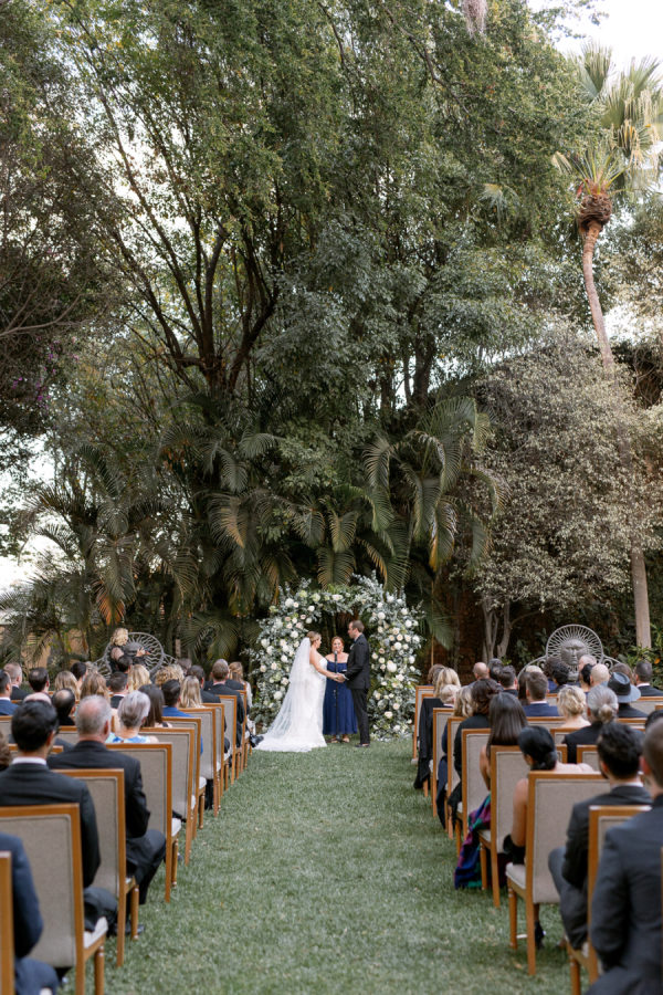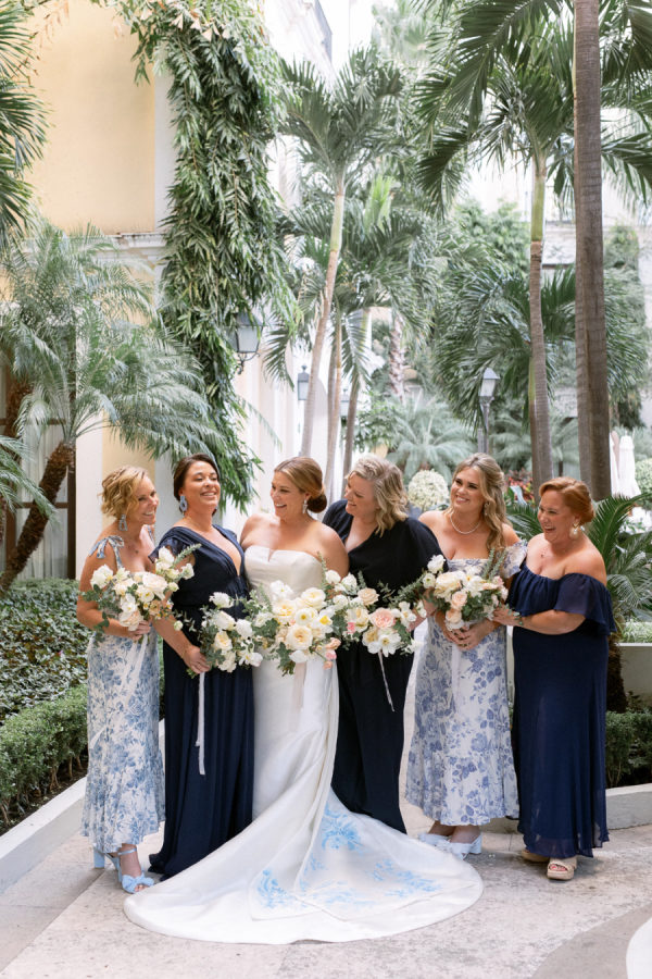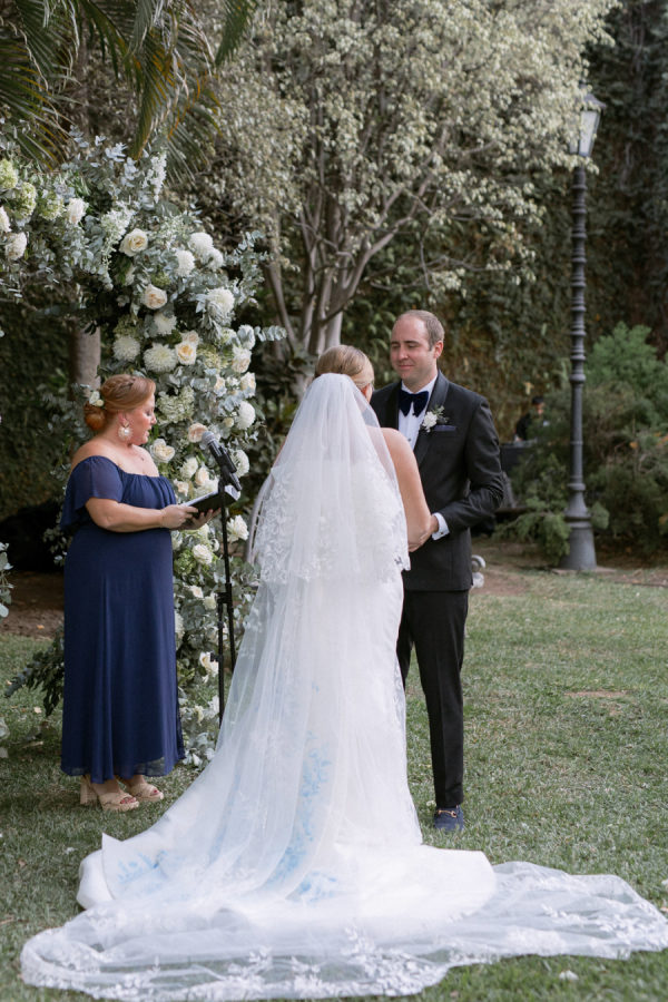 Bridesmaids and the officiant, the couple’s friend Sophie, wore mismatched blue and white midi and maxi dresses of their choice; the blue floral print dresses were from Reformation.