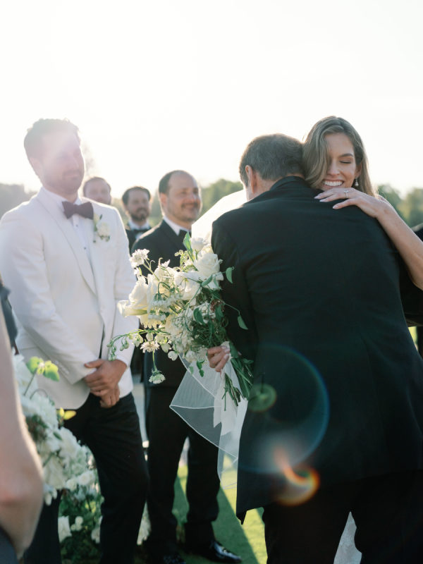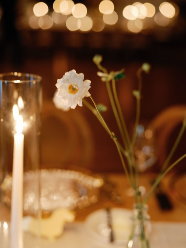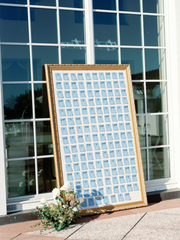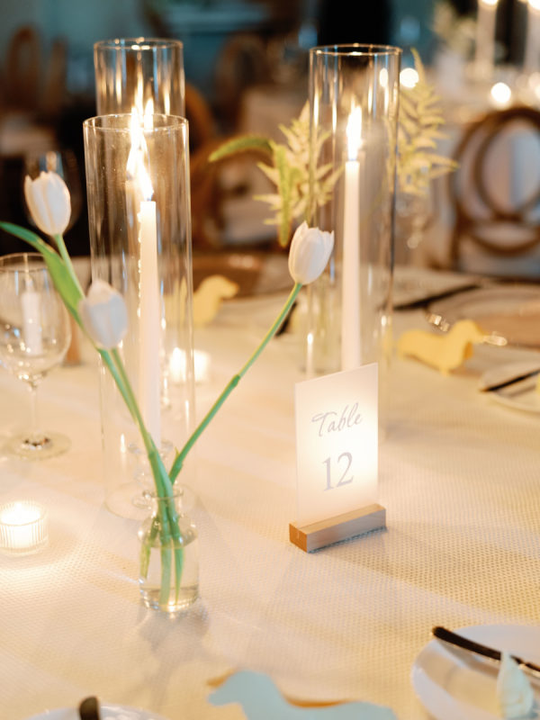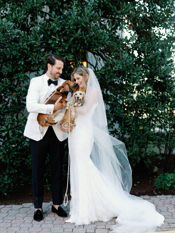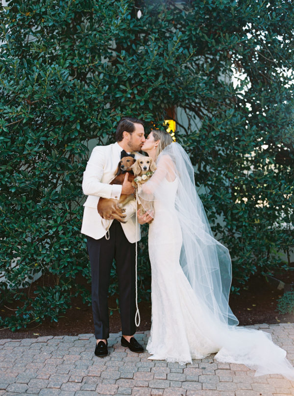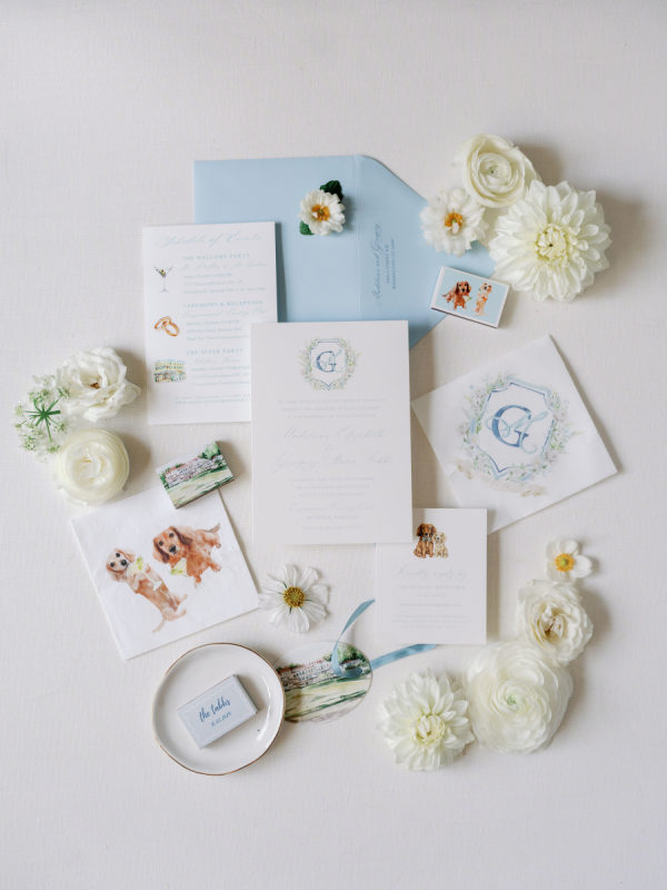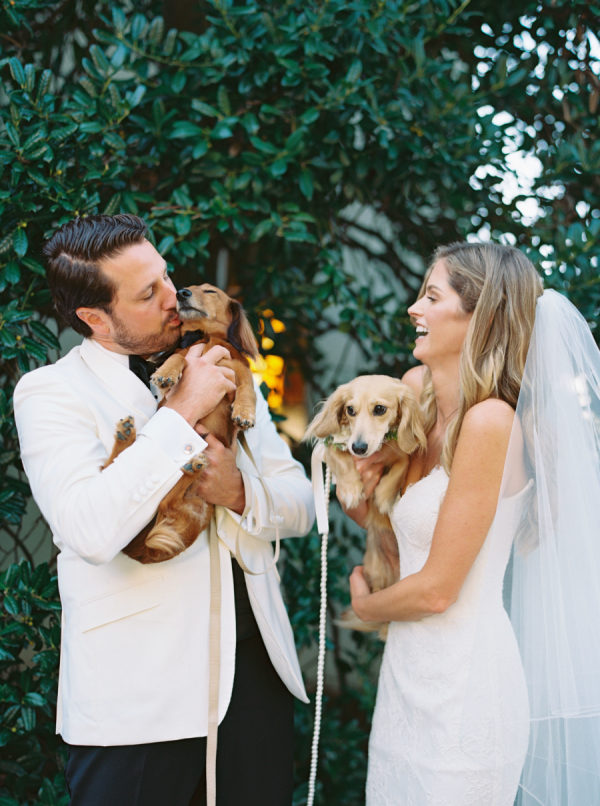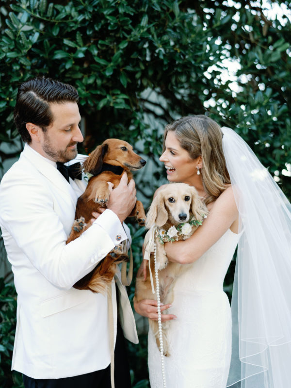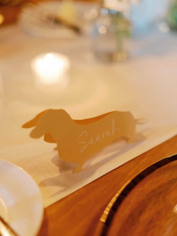 Delicate white florals in a modern design decorated everything for the day. The dachshunds existed throughout the wedding day as well, from on the matchboxes that were gifted to guests, to their table assignment chart at cocktail hour, to guests’ seats at dinner.