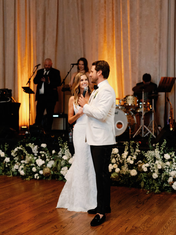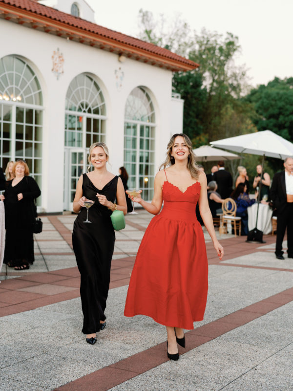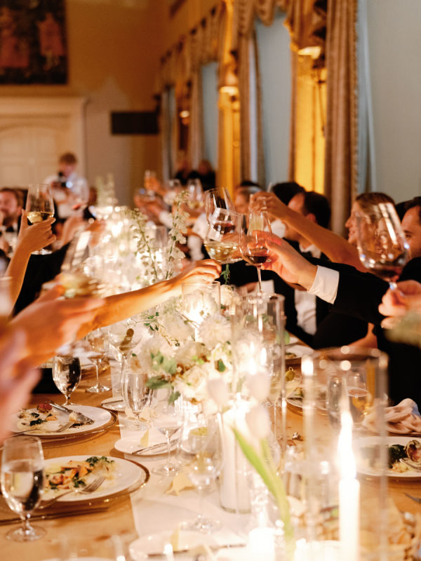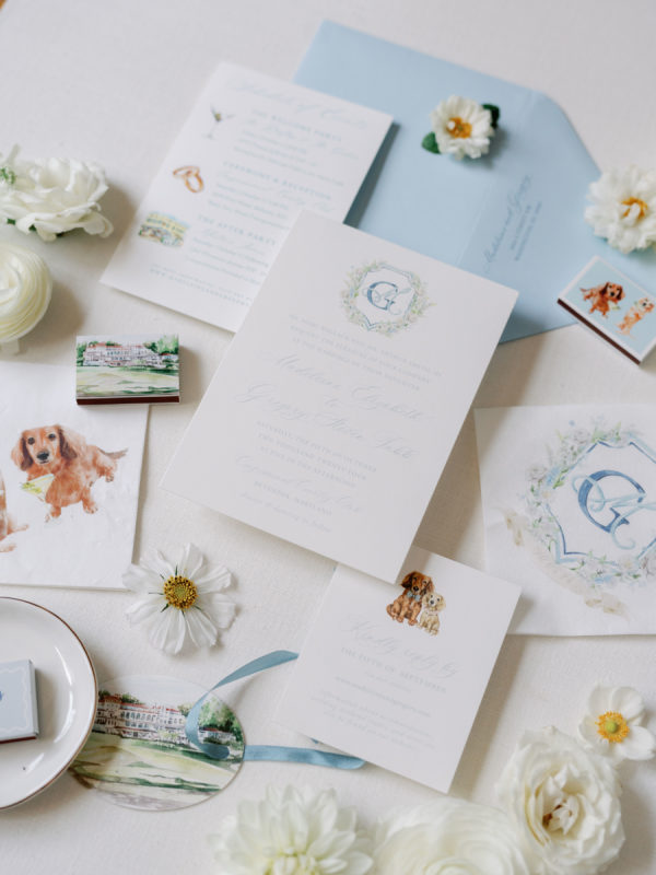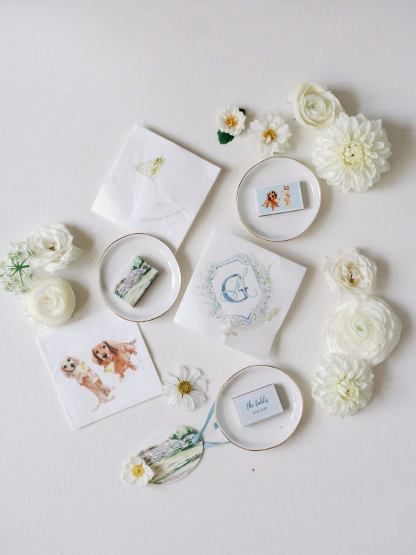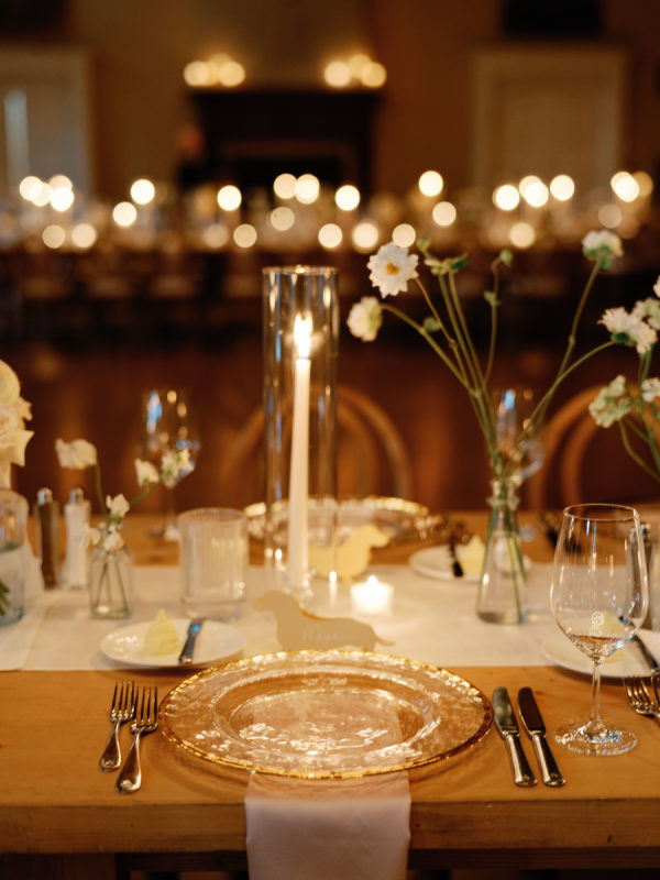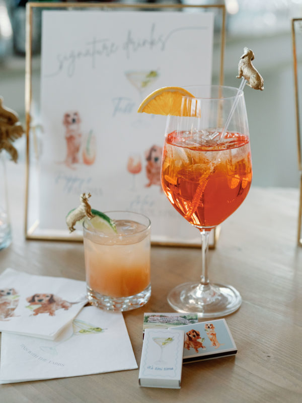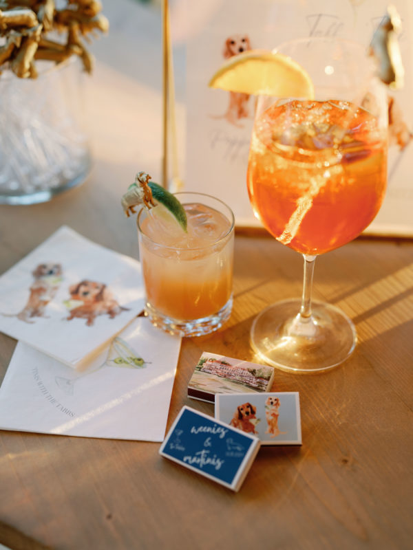 First and foremost, they wanted it to be fun. But beyond that, they wanted something romantic and inviting—warm, intimate, and glowing with candlelight. The bride envisioned a space that felt soft, elegant, and a little magical. To bring that to life, they filled a candlelit room with delicate blooms in bud vases, and statement rustic head tables that complemented and transformed Congressional’s historic ballroom. They also knew that incredible hors d’oeuvres were a must, dirty martinis in hand at all times, and as many nods to their dachshunds, Arlo and Poppy, as possible. If you know these two, you know they love cocktail hours, our wiener dogs, and a perfectly made martini. So, “Weenies and Martinis” became their unofficial, yet incredibly fitting, wedding theme. We also knew that incredible hors d’oeuvres were a must, dirty martinis in hand at all times, and as many nods to our dachshunds, Arlo and Poppy, as possible. If you know Greg and me, you know we love cocktail hours, our wiener dogs, and a perfectly made martini. So, “Weenies and Martinis” became our unofficial, yet incredibly fitting, wedding theme. As planning went on, I kept finding new ways to weave Arlo and Poppy into the details. I fully embraced a “why choose?” mindset when designing the cocktail napkins and matchbox favors, covering them with illustrations of our dogs, Congressional, martinis, and more. Our signature cocktails also paid tribute to our pups—Arlo’s Aperol Spritz, Poppy’s Paloma, and the Tabb Tini (an ode to Greg’s martini recipe crafted during our quarantine days). We even had dachshund-shaped drink stirrers. Guests found their seats at our escort display, where their cards were adorned with alternating dachshund and martini pins. Once there, they discovered their place cards in the form of little dachshund cutouts. Later, as the dance floor opened, oversized cutouts of Arlo and Poppy made their debut (and yes, the posters still live in our home). Looking back, I might have gone a little over the top—but honestly, no regrets. In the end, every detail came together in a way that felt so uniquely us—eccentric dachshund touches and all. Seeing how beautifully the space transformed was incredible, and I’m beyond grateful to everyone who helped make it a night to remember.