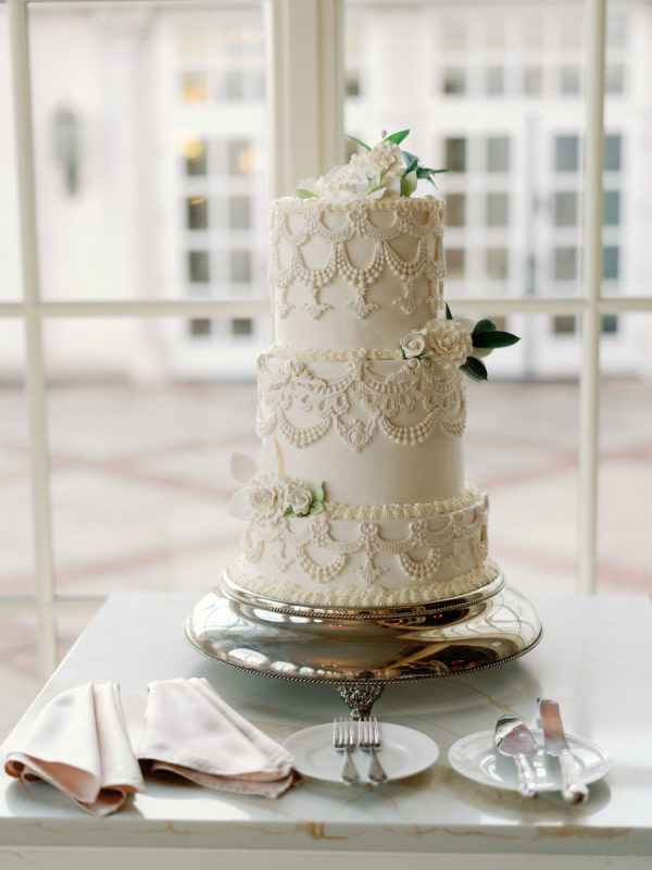 Giving a nod back to the traditional essence of the day, the cake was decorated with traditionally vanilla frosting and adorned with white florals.
