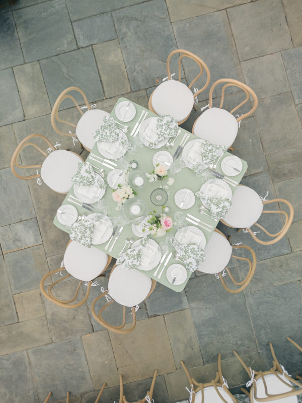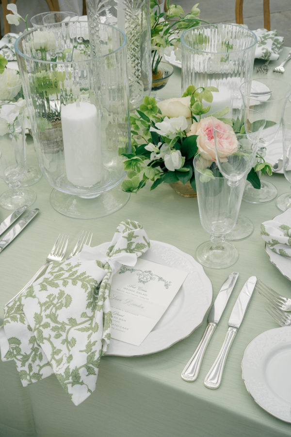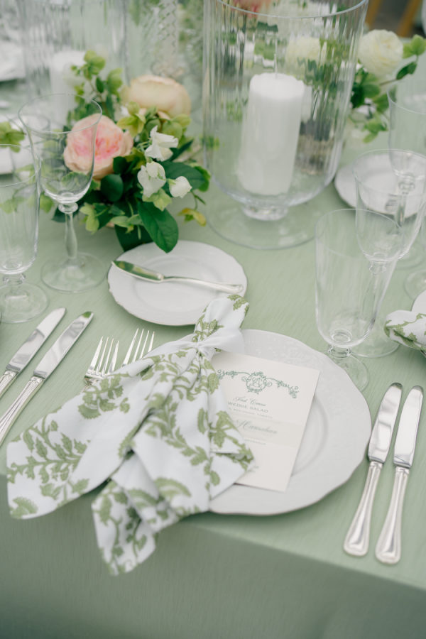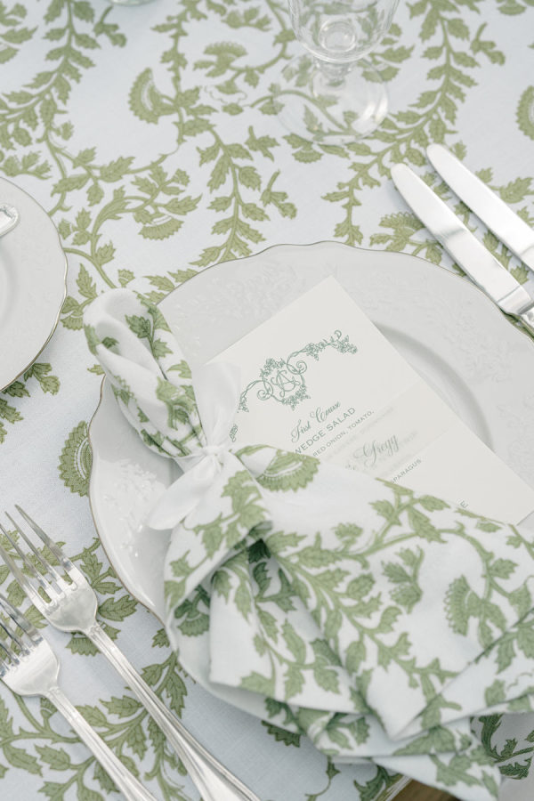 Festoon handled this, and we went with a very organic feel to our arrangements, with a lot of romanticism. Whitney could maybe tell you more about the types of flowers that we used, but I know that there were a lot of roses and peonies, which I love most, in addition to hydrangeas and other beautiful trailing flowers to give our arrangements depth and a natural and not-too-perfectly-sculpted feel. The flowers were a range of whites and very soft pinks and peach, with a balance of greenery as well. We chose vases that were complementary to our “timeless elegance” vision, with a lot of silver and antique selections. Tablescape: In between floral arrangements in our tablescape, we used tall, tapered candles in vintage-style etched glass hurricanes. For our plated dinner, I selected white china with an antique floral design and a silver rim for subtle elegance. Our linens were a variety of green and cream tones, with both prints and solid textures, to honor the garden aesthetic that I wanted to highlight, being an outdoor wedding. Custom duogram-embroidered linen napkins and sterling silver antique napkin rings were used at the head table for an extra special element. One important aspect of the tablescape to me was that I wanted to ensure all guests could see each other across the table in order to promote conversation and the feeling of an intimate dinner, where our guests could enjoy getting to know each other. Each guest had a custom menu with their name printed on a belly band for a personal touch. Table Assignment Display: In order for guests to find their assigned table number, we had a display on silver trays of custom matchbooks that I drew and designed. Each matchbook was individually printed with the guests’ names and table numbers and also served as a fun party favor. This idea was inspired by my love of collecting matchbooks from restaurants, which is especially popular where we live in New York City. Grabbing a matchbook when entering a restaurant, before we sit down for dinner, is always the first thing that my friends and I love to do when we go out to eat! Bar: On our primary bar, we incorporated a custom wrap that featured a rose trellis design that I had drawn and also used in my invitation suite. Raffia Fans: We provided woven raffia fans for our guests to stay cool both during the ceremony and by the bars, which was another way to tie in natural elements, coupled with the bridesmaids’ sweetgrass basket bouquets, and to ensure that guests remained comfortable throughout the night. Lighting: In keeping with my goal to honor the natural landscape and outdoor setting of the wedding as much as possible, we opted for simple and charming string lights in a clear-top tent, so that the lights would reflect off the tent and feel just like being outside, enjoying the twinkling stars at night. It was also really fun when we brought out the dancefloor props and disco cowboy hats toward the end of the night, because you could see the sparkling reflections in the tent overhead.