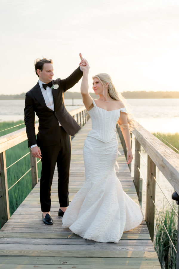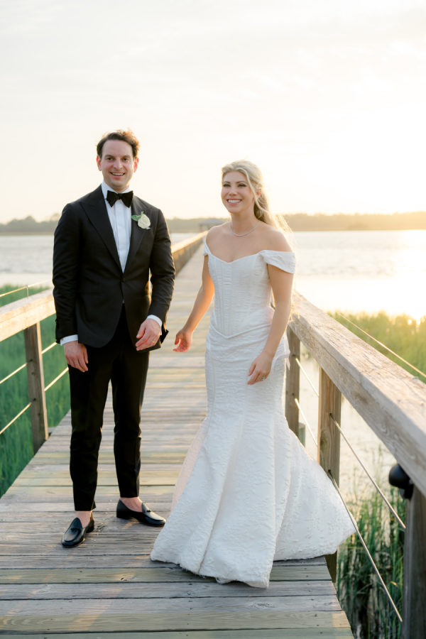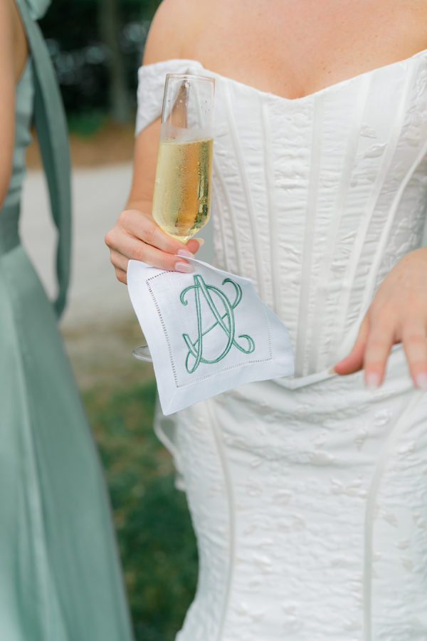 In addition to drawing my inspiration from the venue and landscape for my design aesthetic, it was important to me to create a feel of tradition and timelessness at the wedding. I wanted anyone to be able to look back on our special day in ten, 50, or 100 years and feel that it was classically beautiful and romantic in a way that would never go out of style. Adam and I both share “a love of old things,” as we say, so incorporating vintage elements, such as my collection of antique sterling silver napkin rings, was a way to honor the tradition of “Something Old.” We are also passionate travelers, so we included a gelato bar as a nod to Adam’s Italian heritage and used “The Monocle Book of Japan” coffee table book for our guests to sign in acknowledgment of our honeymoon destination. Lastly, an important part of my vision was for our celebration to feel deeply personal. As an artist, I enjoyed creating a custom design for our wedding invitation suite and all print material used on the day of the wedding, including our rose trellis bar! We used my hand-drawn duogram and wedding crest to embroider custom linen tea towels, dinner napkins, and cocktail napkins. Lastly, my bridesmaid gifts were handmade sweetgrass baskets, which were used to hold the bridesmaids’ floral bouquets!
