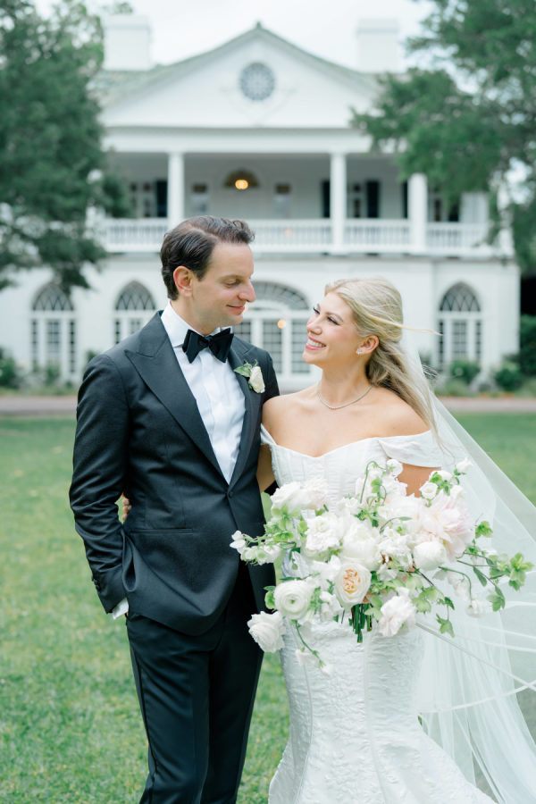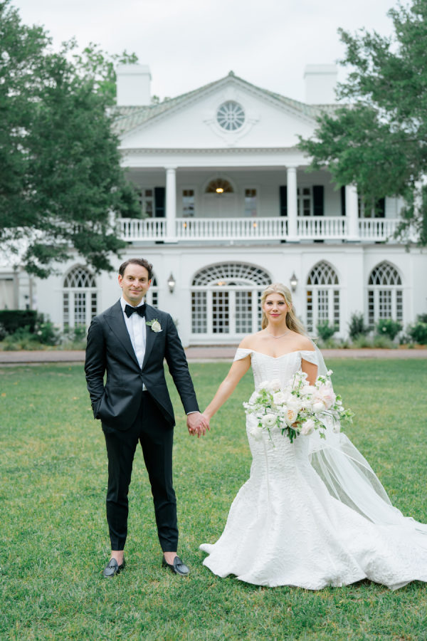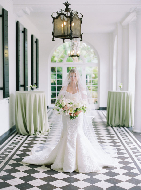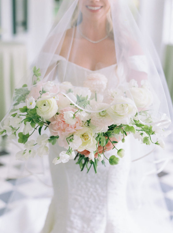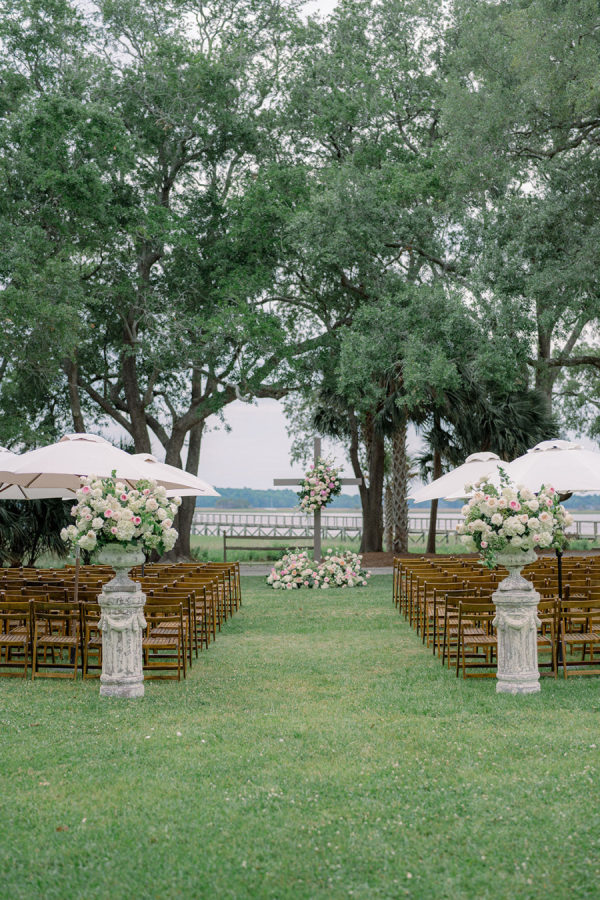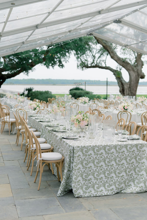 For my wedding color palette, I was very inspired by the natural landscape of the venue. Along with white as a romantic and timeless wedding-day anchor, I wanted varying shades of green and sage, drawn from the natural landscape of the venue (think sage greens and blues of the Ashley River, Spanish moss, palm trees, and Charleston green). I also wanted soft pinks, blush, and peach for a pop of color inspired by the sunset view from Lowndes Grove, in addition to bringing in warm tones to play off the candlelit dinner once the sun went down.