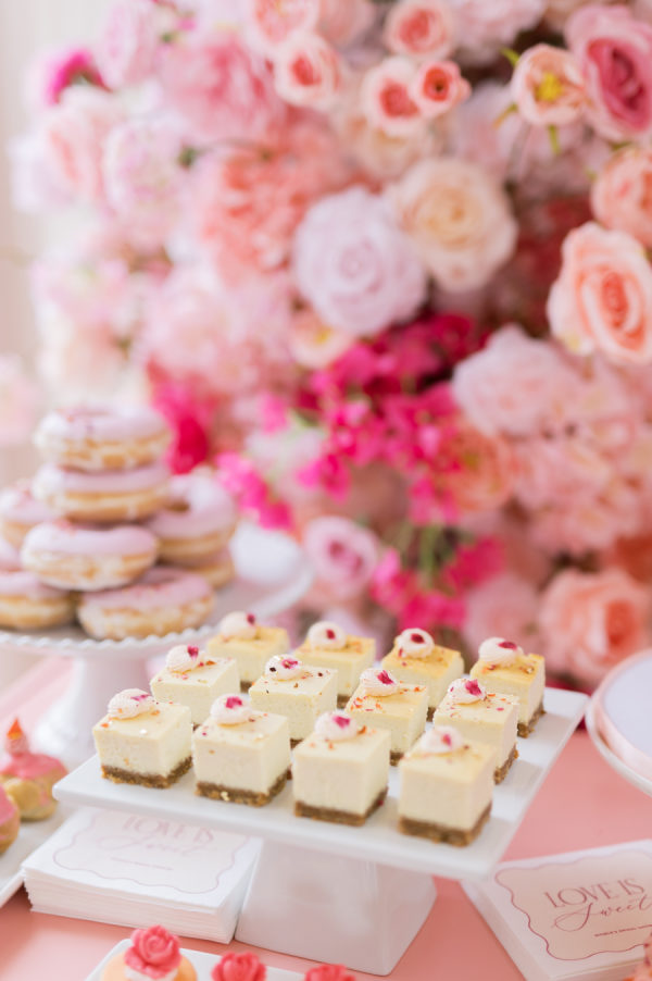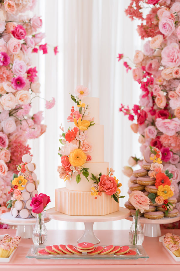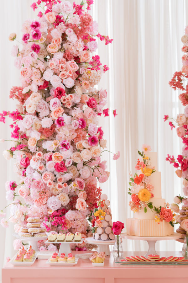 The florals and décor were intentionally flower-forward, featuring hundreds of stunning ranunculus and roses in a rich mix of coral, blush, and warm pink tones. With little to no greenery, the design allowed the soft, feminine hues to truly shine, creating a romantic and elevated atmosphere throughout the space. Each place setting was accented with its own floral arrangement, bringing the blooms up close and creating an immersive tablescape, while the head table was wrapped in lush, vibrant florals that beautifully framed the bridal party. Behind the sweets table, floral towers completed the scene, forming a breathtaking backdrop and tying the entire design together with elegance and impact.
