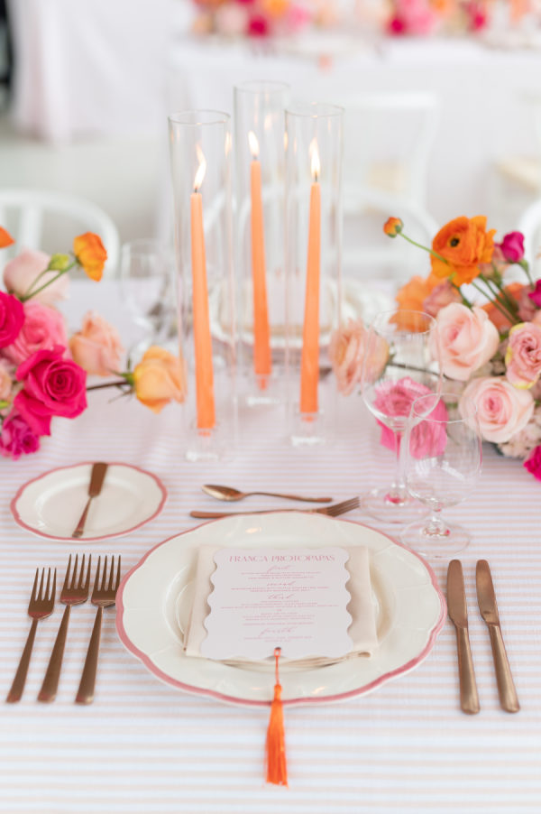 The palette was intentionally vibrant yet soft: bright coral, warm pink, layered blush tones, and crisp white. Together, these hues created a fresh, romantic look that felt both elevated and joyful — a beautiful nod to Mediterranean warmth while remaining timeless and refined.