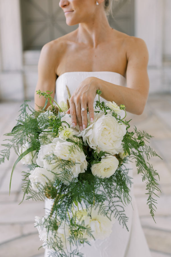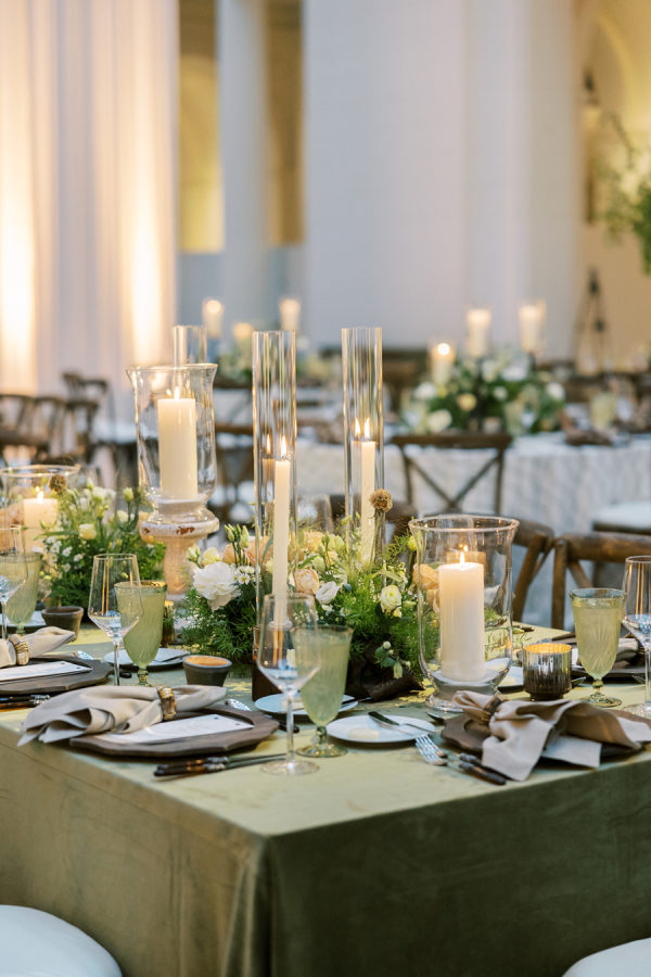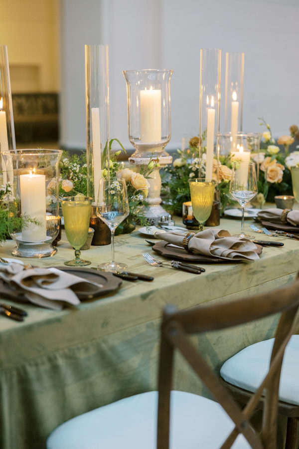[field title=”Wedding Colors”]They chose a palette of varying shades of green, ranging from rich olive to soft moss. To enhance the design, warm hues of amber, copper and deep walnut were accented, which not only represent earth tones of the Irish landscape, but also infuse a cozy, inviting warmth into the grand space.[/field]