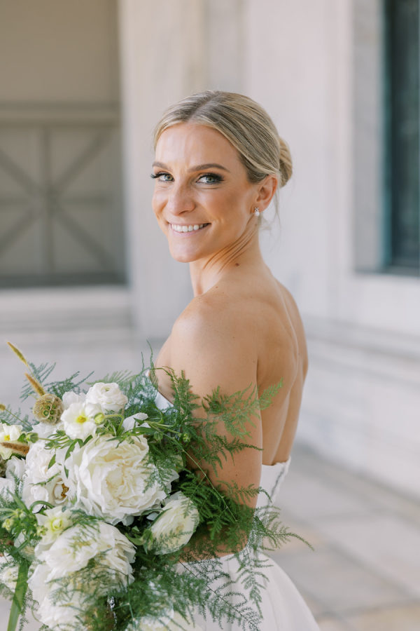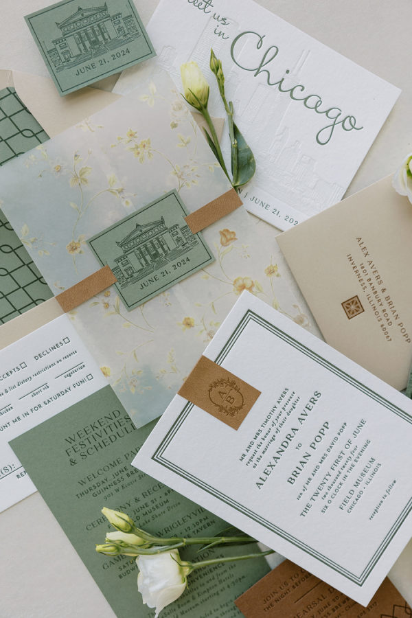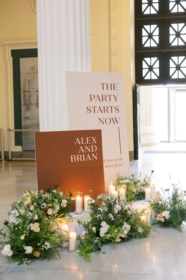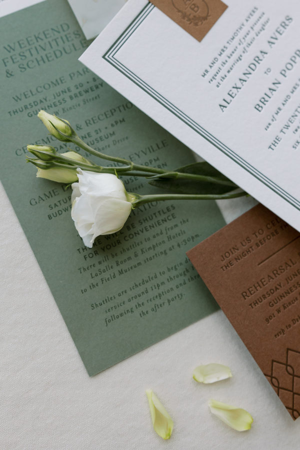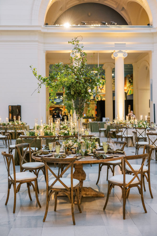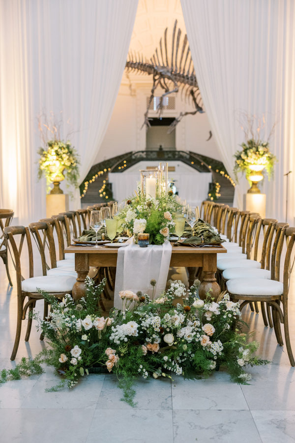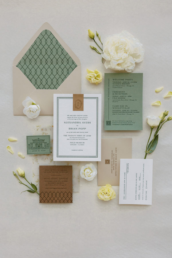 Alex & Brian’s inspiration was Ireland – where their love story blossomed. Every corner of the breathtaking country is steeped in history, and they wanted to bring a piece of that magic to Chicago. They also wanted to highlight their love for the Chicago Cubs & subtle tributes to their fur baby Ivy. The couple envisioned a rich aesthetic that echoed the beauty of wood, iron and leather, reminiscent of charming Irish pubs and the rugged elegance of the countryside. They didn’t want to lose the delicate details that a wedding day embodies so to achieve this balance, they incorporated intricate trellis & ivy accents, soft and lush floral arrangements, and candlelight that danced against the dark wooden tables. They also wanted to celebrate their love for Chicago. Subtle nods to their favorite sports teams were woven into food and beverage selections. They opted for the classic Chicago Hot Dog & Beef Sandwich for late night bites that were presented to guests in hocker tray just like you would see at a Chicago Cubs Game (the couples favorite!), paired with a signature cocktails inspired by their dog, Ivy, named after the famous Ivy of Wrigley Field. The sweet details sprinkled in helped make everything feel personal, custom and intentional. The Field Museum transformed into an old Irish estate perfectly placed on the lakefront in Chicago! Ultimately, the wedding was a beautiful fusion of their love for each other, their roots in Ireland, and their shared life in Chicago. It was a day filled with laughter, love, and memories, where every detail—down to the last shade of green—told their story. The couple also noted “We are thankful for the partnership with Events to a T especially Emily and Bailey for their attention to detail, creativity and bringing our dream to life.”