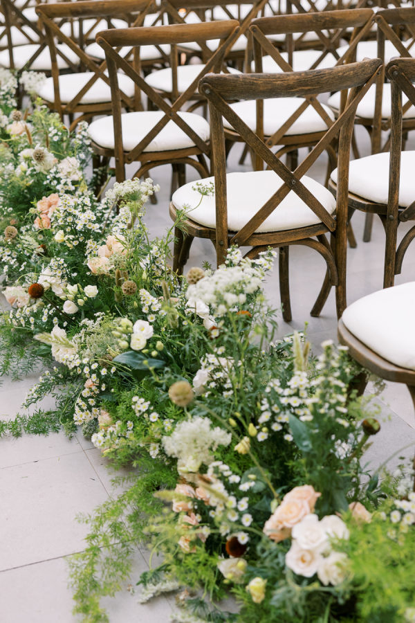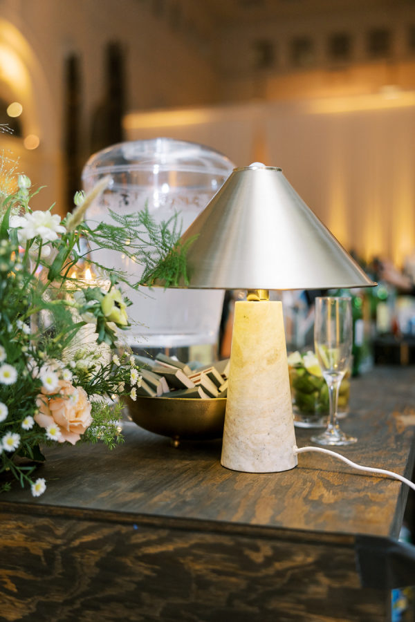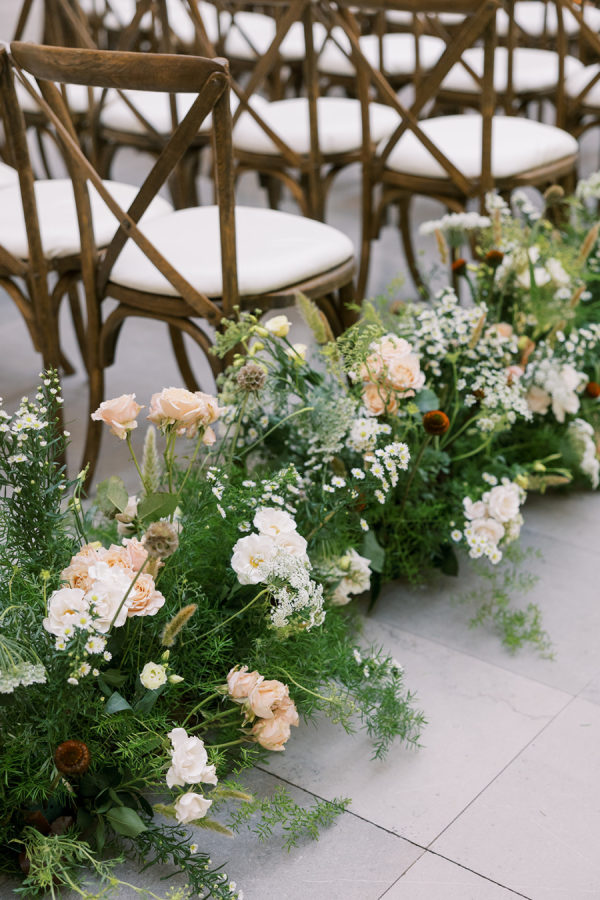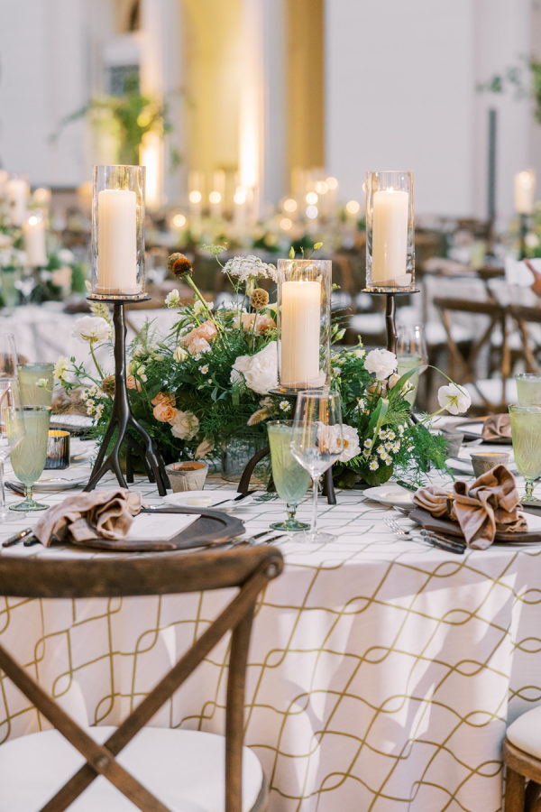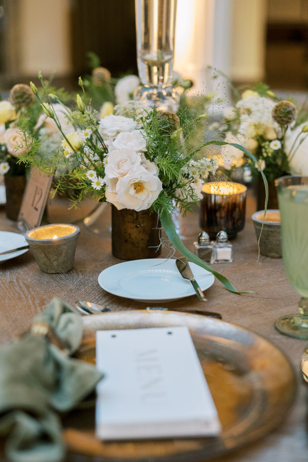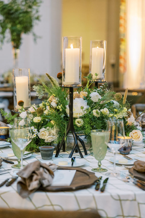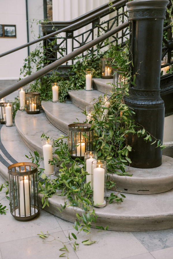 Florals were provided by Kehoe and beautifully incorporated the wispy, ivy-like greens and delicate use of warm amber color throughout. They opted for a lot of stone & iron vessels and candles to again bring in the Irish pub accent.