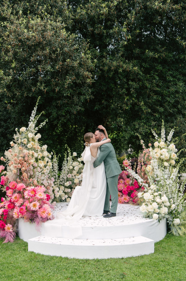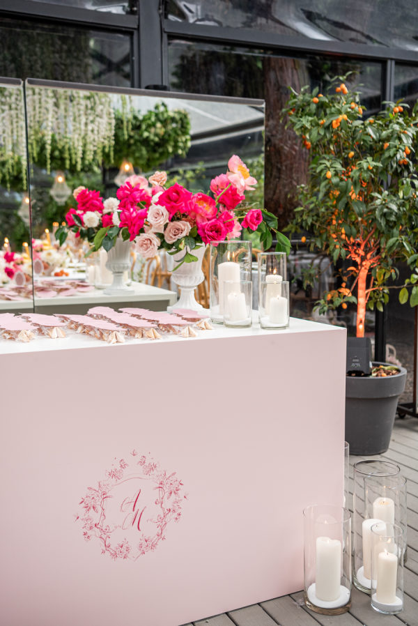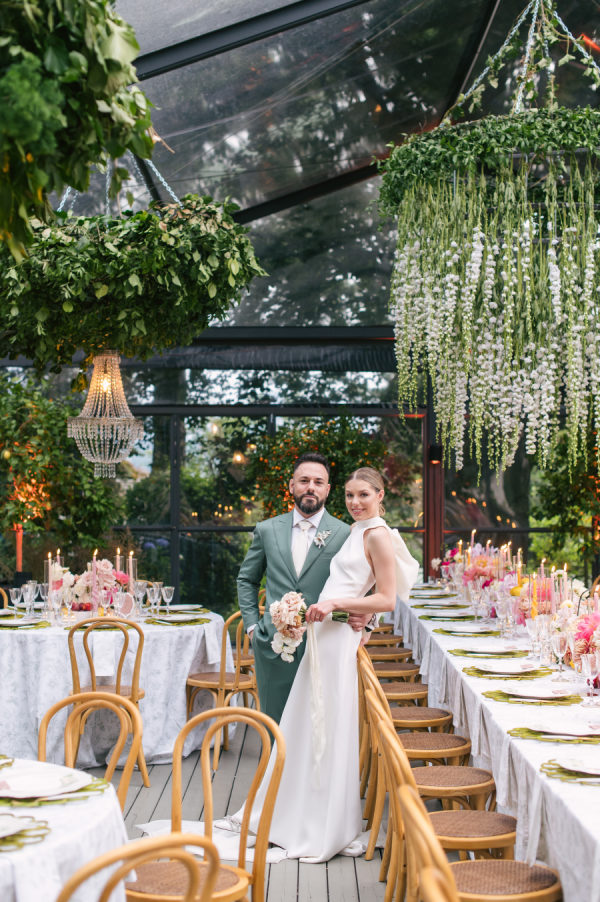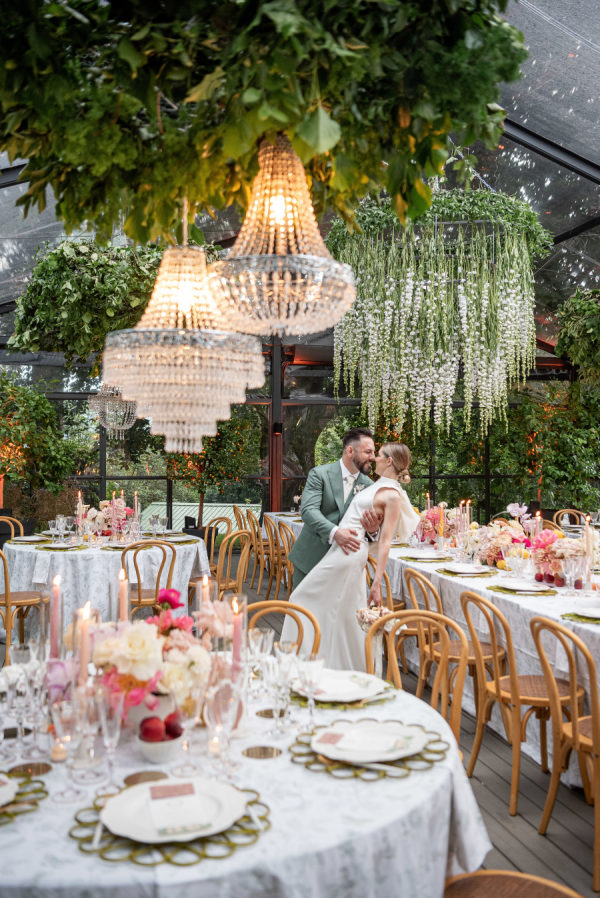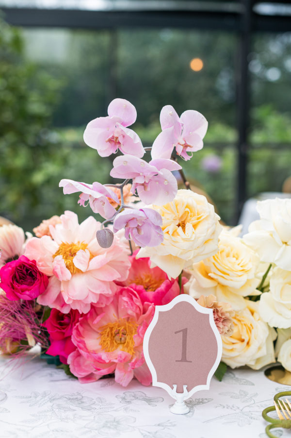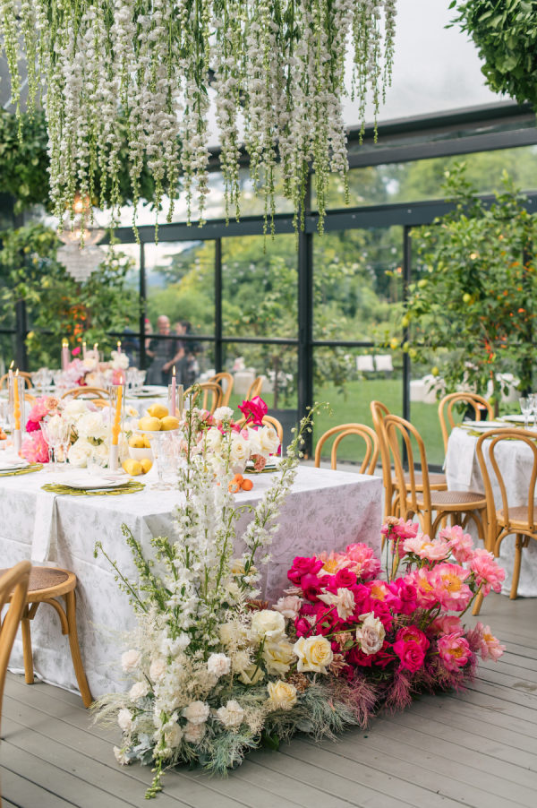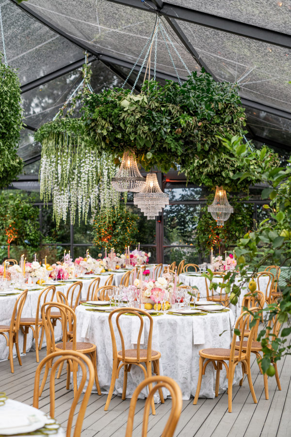 The floral design was nothing short of breathtaking — lush, sculptural, and bursting with color. The ceremony took place beneath a large circular platform adorned with a dramatic floral arch that enveloped the couple like a warm embrace. It stood tall and radiant, a sea of summer blooms surrounding it in every direction. The reception, held in a glass greenhouse, featured cascading floral chandeliers and crystal lighting wrapped in greenery. Long tables were transformed into blooming gardens — a floral dreamscape in every shade of pink, peach, and cream. From petal to pattern, every detail was layered with intention and artistry.