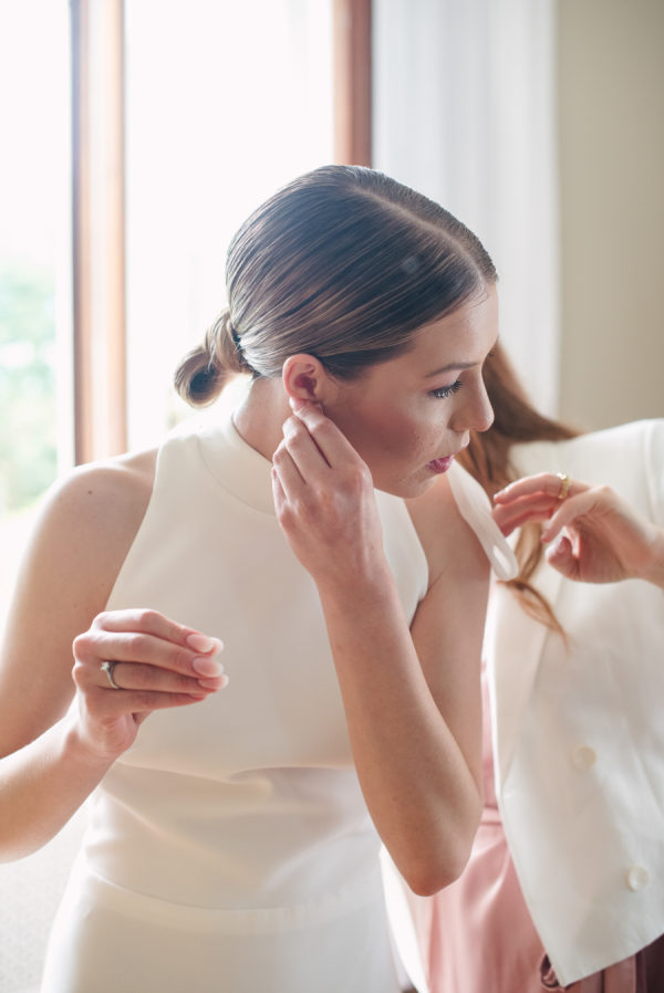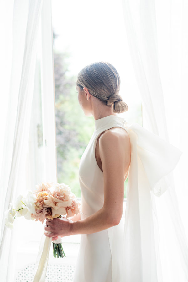 [field title=”Wedding Gown”]Alice’s dress is extremely elegant, smooth at the front but with a magazine-worthy bow at the back, complementing her gorgeous, fashionable updo.[/field]