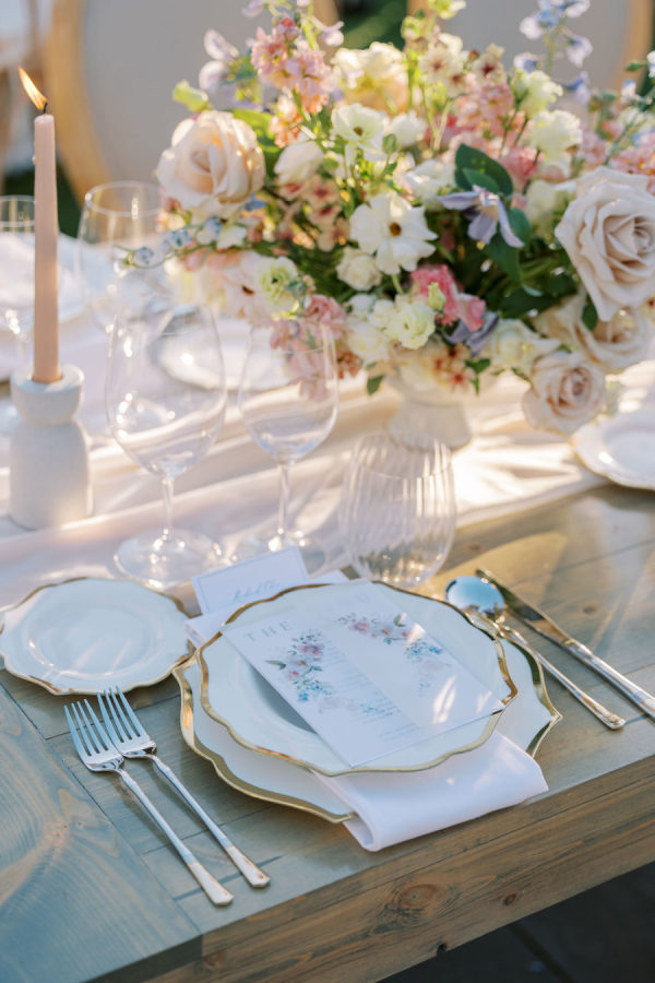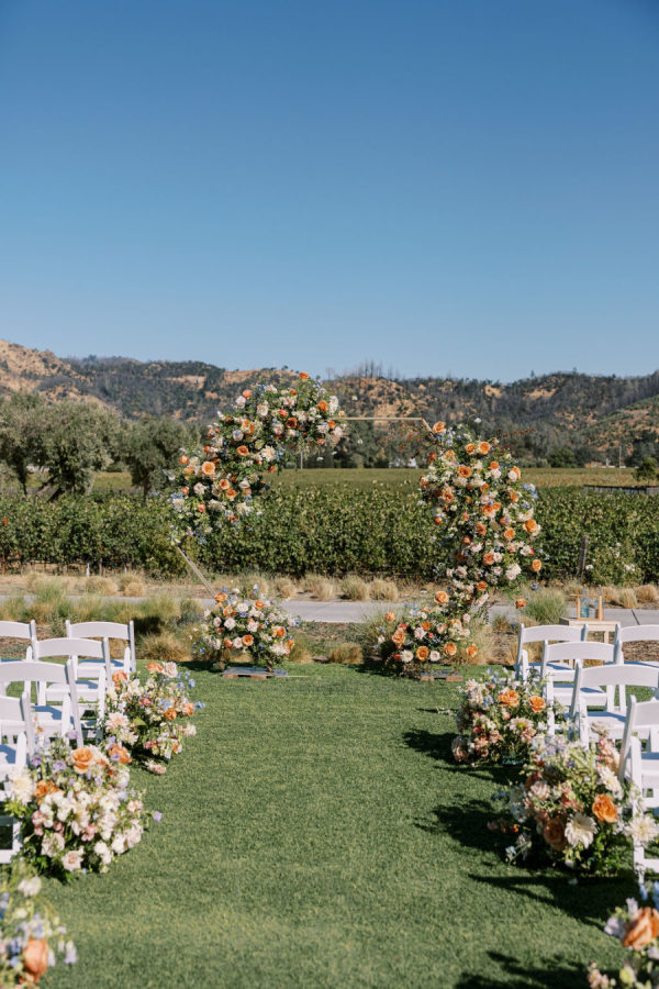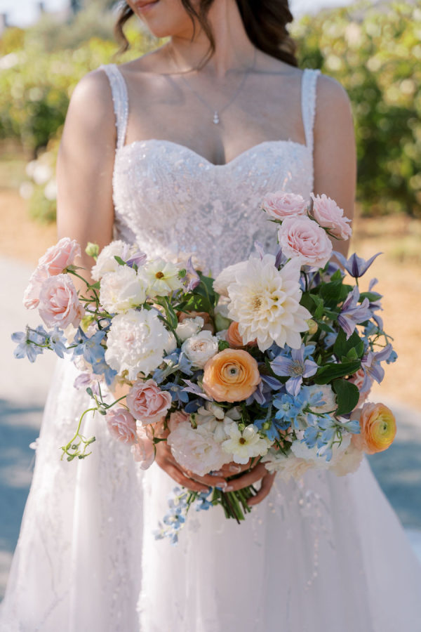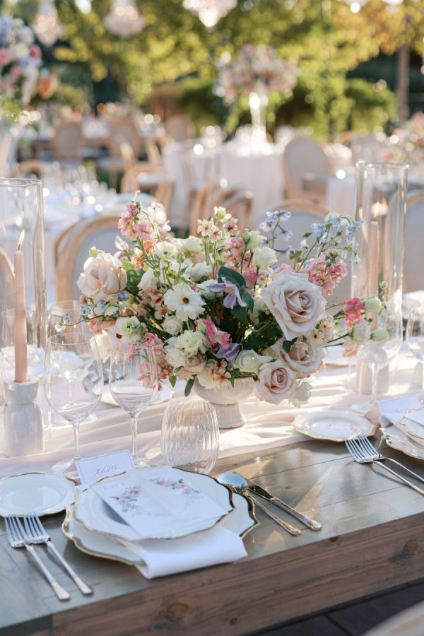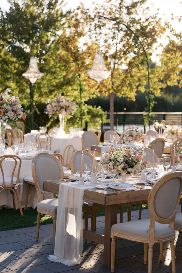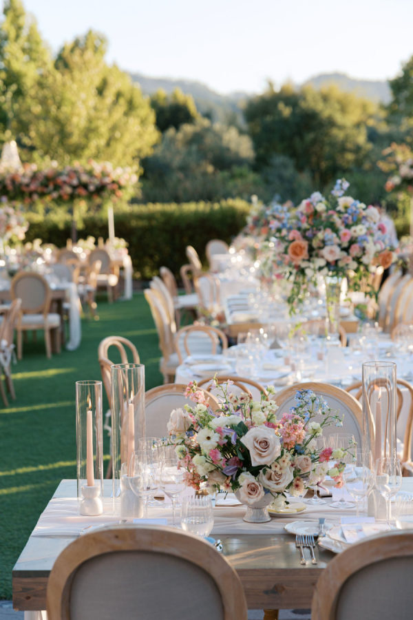 The florals and décor at this Napa Valley wedding were nothing short of enchanting, thoughtfully designed to complement the natural surroundings while infusing the celebration with elegance and charm. The floral arrangements showcased a lush, garden-inspired aesthetic with a romantic palette of soft pinks, blush, lavender, ivory, and fresh green. Each table featured full, airy centerpieces composed of seasonal blooms like roses, sweet peas, lisianthus, and delphinium, artfully arranged to feel organic yet refined. The variety in floral height and texture added depth and movement, with tall arrangements drawing the eye upward and lower pieces creating intimate beauty at guest tables. Tables were styled with flowing, sheer runners in a soft ivory tone, delicately draped to create a light and ethereal effect. Neutral taper candles in minimal ceramic holders added warmth and sophistication, casting a gentle glow as the sun dipped lower in the sky. The seating was an elegant mix of round and wooden farmhouse-style tables, surrounded by natural wood and upholstered chairs in soft linen tones, striking a perfect balance between classic and rustic refinement. Overhead, crystal chandeliers hung from arched stands wrapped in greenery, adding a touch of glamor and romance to the open-air setting. Together, the floral and décor elements created a cohesive look that was dreamy, fresh, and deeply personal, perfectly suited for a heartfelt celebration in the heart of wine country.