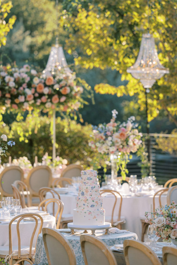 This wedding cake was a true showstopper. Elegant, romantic, and perfectly in tune with the overall aesthetic of the day. The four-tiered design is classic in structure but whimsical in its detail. Each tier is covered in smooth, white fondant, serving as a clean canvas for the intricate floral embellishments that cascade down the entire cake. The hand-piped buttercream florals are delicate and dimensional, featuring a mix of soft pinks, muted purples, blush tones, gentle blues, and hints of leafy green. These pastel blooms create a painterly, garden-inspired look that feels fresh and feminine without being overly sweet. The varied flower shapes and lifelike petals add texture and depth, giving the illusion that the flowers are gently blooming right off the cake. The cake is displayed on a light blue and white patterned linen, placed atop an elegant round stand with gold-toned legs, adding just the right amount of sophistication to the presentation. In the background, you can see soft, neutral-toned chairs, crystal chandeliers hanging from trees, and blurred floral arrangements, all of which create a magical garden-party ambiance that complements the cake’s design beautifully. Altogether, the cake not only served as a delicious dessert but also as a central design element that tied together the couple’s romantic, floral-forward vision.