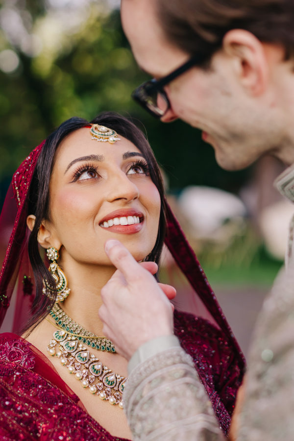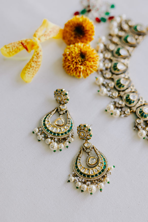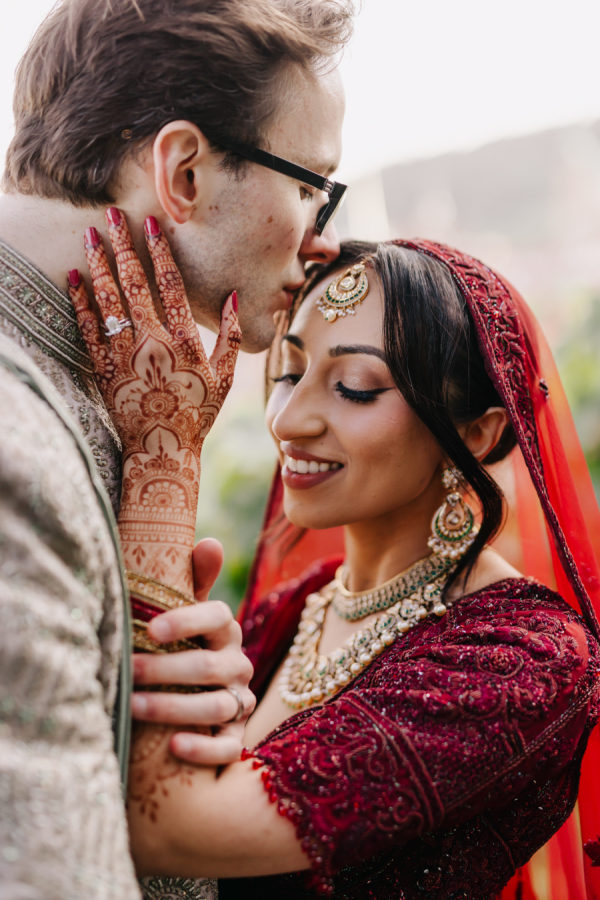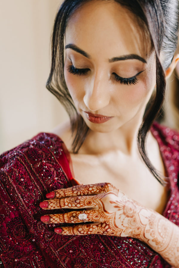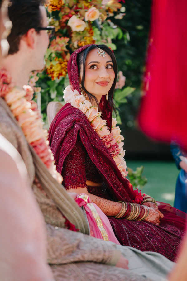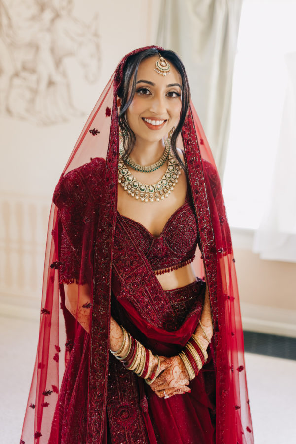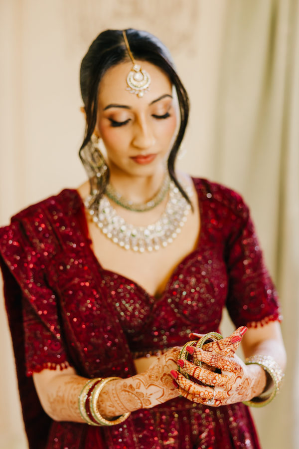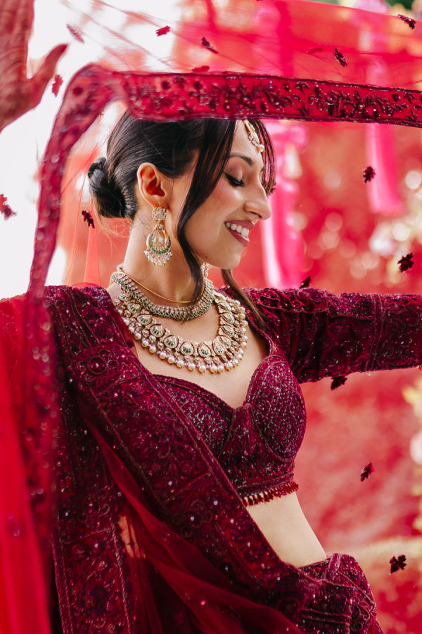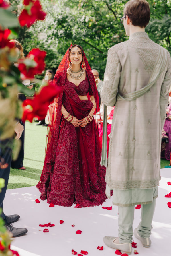 The bride wore a deep wine–colored lehenga with intricate beading that reflected the light throughout the ceremony. The embroidery extended across the lehenga skirt and blouse. She paired the look with a sheer wine-toned veil, which, like the lehenga, included emerald green accents threaded through the palette. The touches of green added dimension and echoed the emerald details on the groom’s traditional Indian sherwani. The lehenga was from Frontier Raas in Delhi, India.