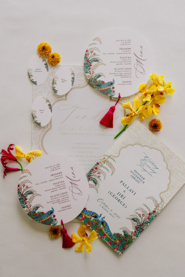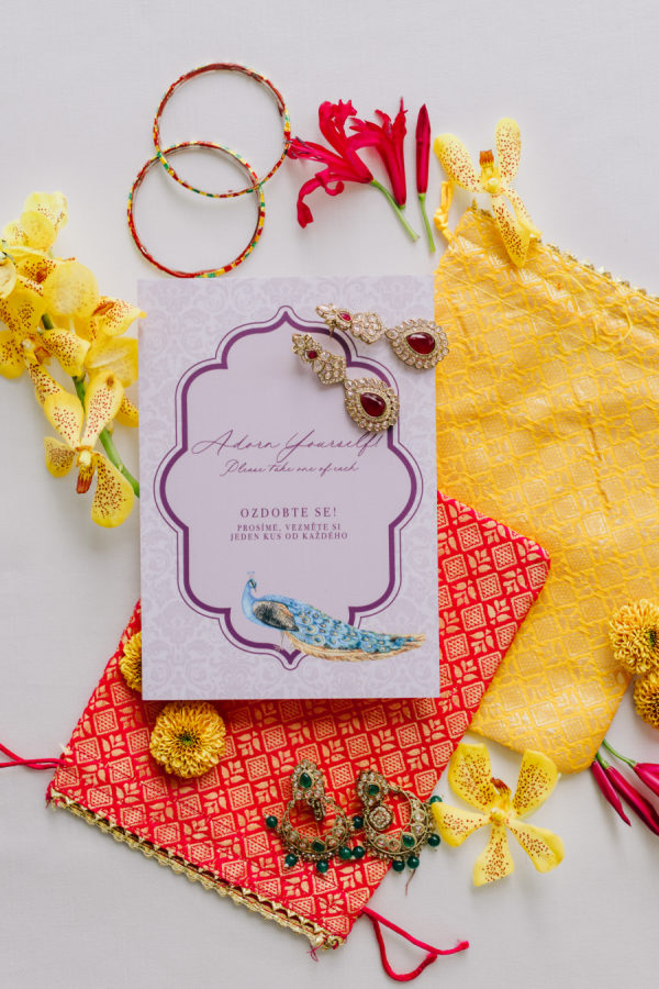 To keep authenticity, many items were delivered directly from India – from saris for both families, to pashminas for ladies, beautiful earrings and bracelets that ladies took as a gift, in a lovely traditional indian bag. We customized 2 stalls, in on was placed the jewelry, in other served traditional masala chai, decorated by indian spices in packets from India. The couple sits in front of a beautiful wall with original fabric wallpaper, decorated by peacocks, that was also delivered from India. Peacocks were used at all stationery, especially a beautiful order of service, which perfectly explained the ceremony for Western guests.