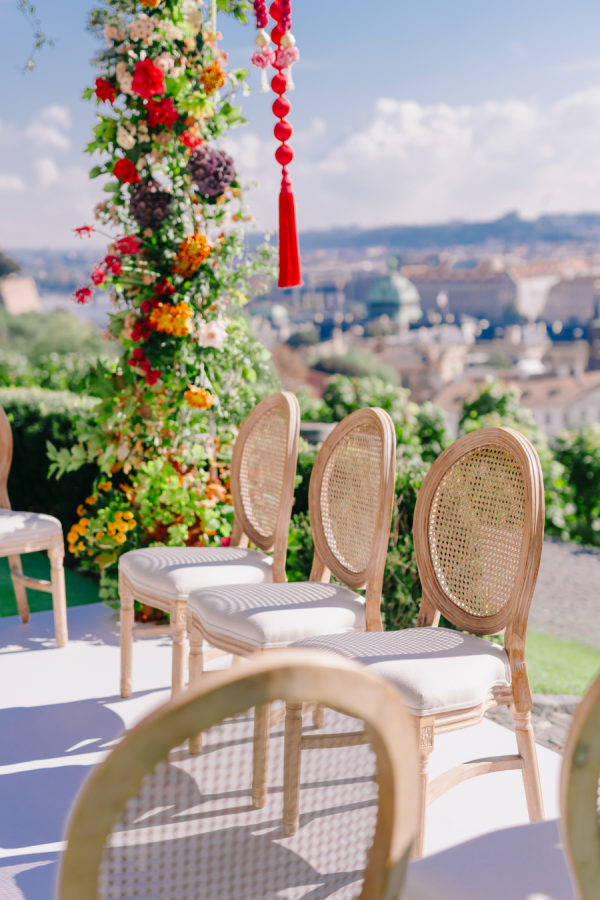 Fusion of indian and Eastern ceremony and reception. The ceremony was being held at the vineyard with a stunning view of Prague, in a traditional mandap. There are little stones on the ground, which are not comfortable for high heels, so we covered the whole area with green astroturf.