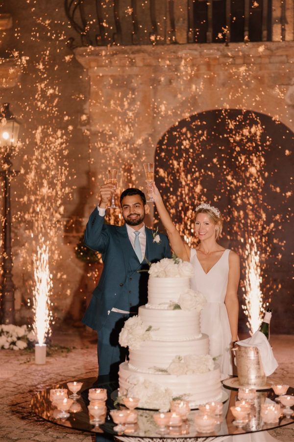 Food & Drink: For my husband, a self-proclaimed foodie, this was the most important part of our wedding. At Castello Monaci, we served canapés followed by a five-course dinner showcasing the best of Italian cuisine, including burrata, lobster pasta, salt-crusted fish, and lamb chops. Instead of the traditional dessert buffet offered by the castle, we opted for a trio of desserts to be served individually at the table, ensuring a personalized touch while avoiding any potential issues with flies. We used the dessert tables later to serve our wedding cake. For the Indian Sangeet, we flew in MasterChef semi-finalist Arbinder and his team to create an unforgettable dining experience. The Chiostro chefs were incredibly accommodating to them, even assisting in advance to source equipment and ingredients—a monumental effort that was truly worthwhile. The food was nothing short of spectacular!