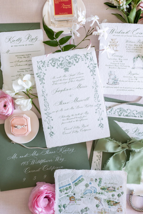 With touches of bows and hints of green, Shane and Josie were married at Carmel Valley Ranch in a celebration filled with elegant, feminine details. Josie worked closely with her mom throughout the planning process, discovering a green bar early on that became the cornerstone of their design. Colors and flowers were chosen to complement it, blending joyful blush blooms with a garden-inspired aesthetic. “Everything was beyond our wildest dreams,” the couple shared. After their Italian honeymoon, they look forward to reliving the day again and again through photos and cherished memories.