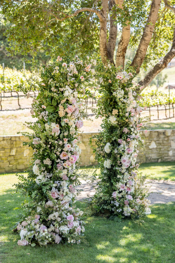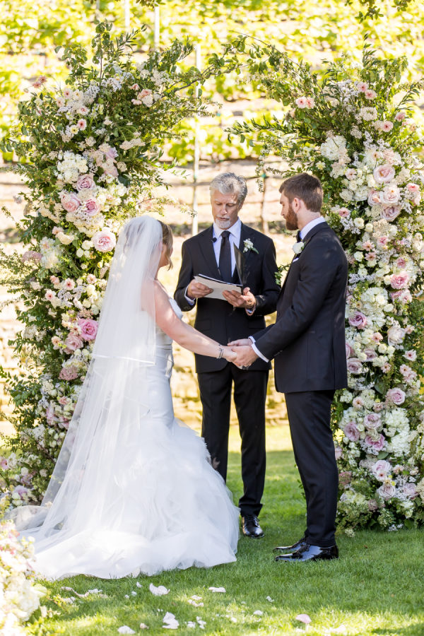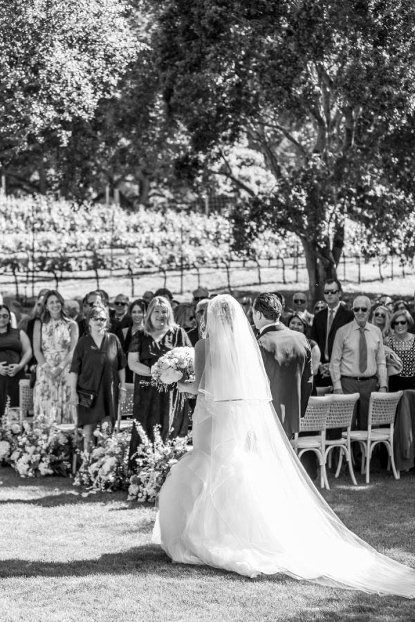 The ceremony, officiated by Shane’s father, was heartfelt and romantic, set beneath shady trees with vineyard views.
