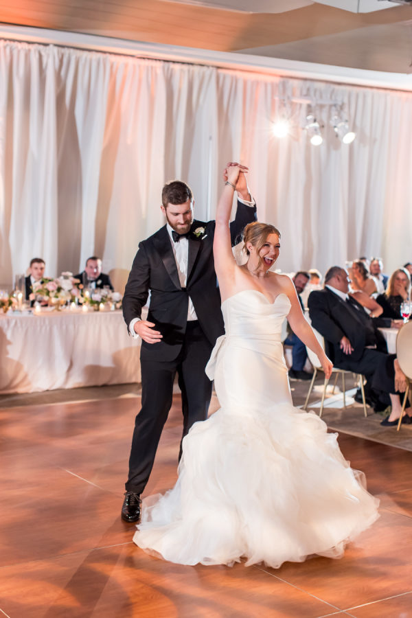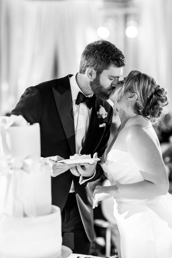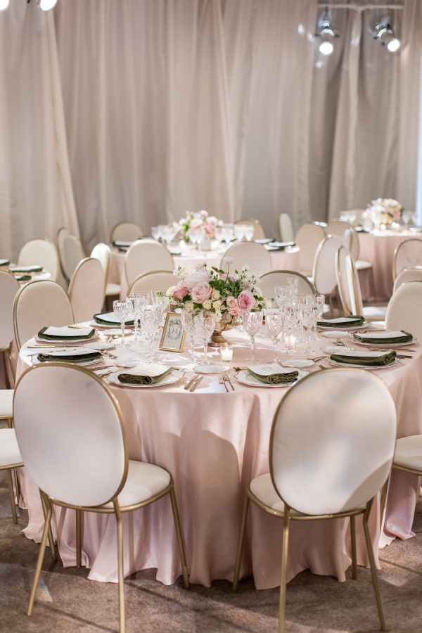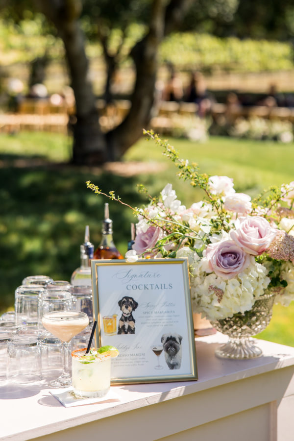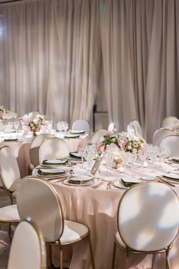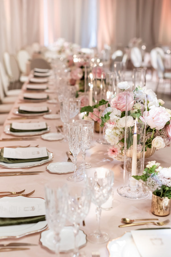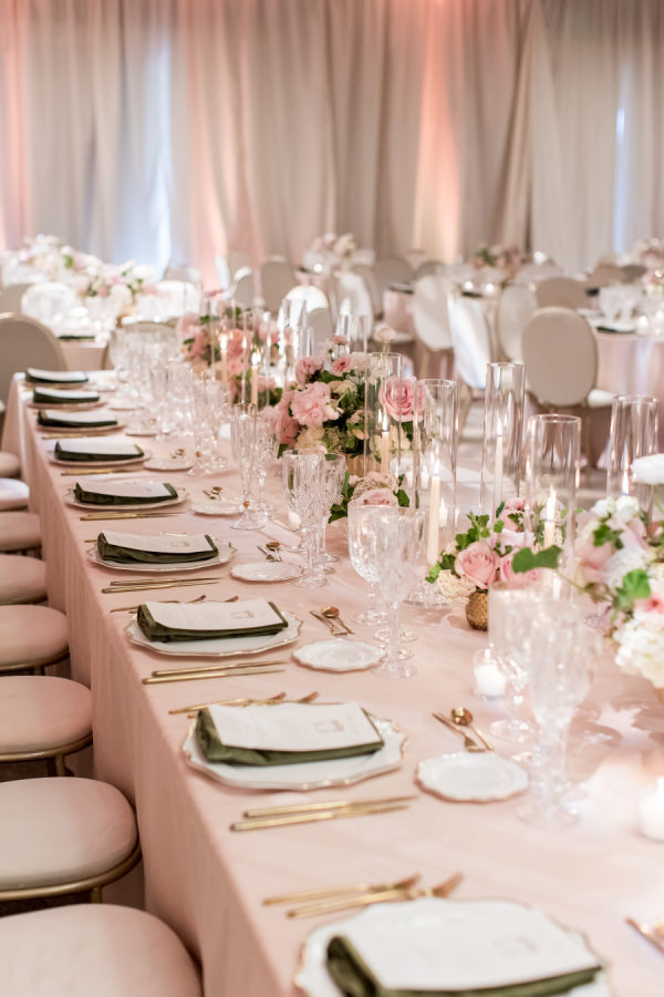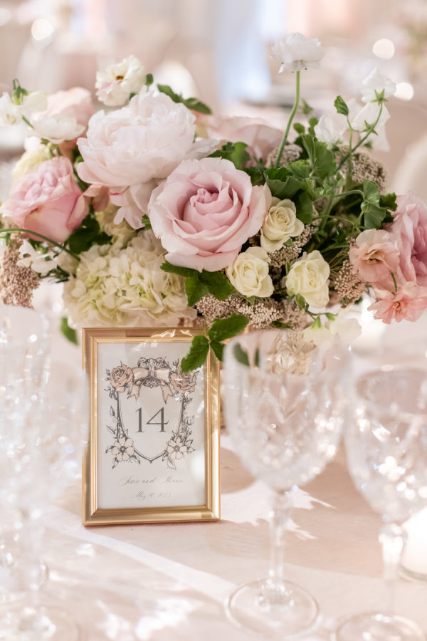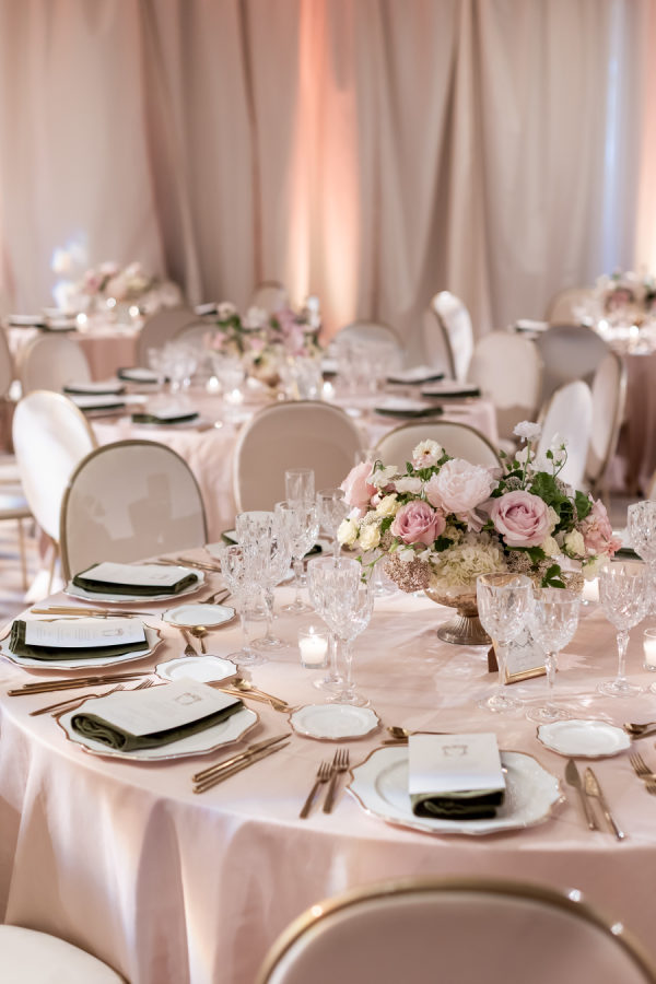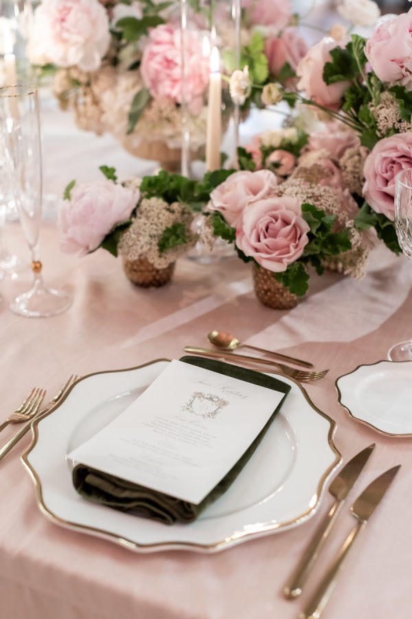 Together, Josie and Shane loved seeing it all come together: a lush floral arch, a signature cocktail sign illustrated with sketches of their dogs, a flower-box-inspired seating chart that doubled as a photo backdrop, and a custom crest woven throughout the decor. The evening unfolded into a reception awash in soft pink, where satiny tablecloths, crystal, candlelight, and a bow-adorned cake created a dreamy atmosphere.