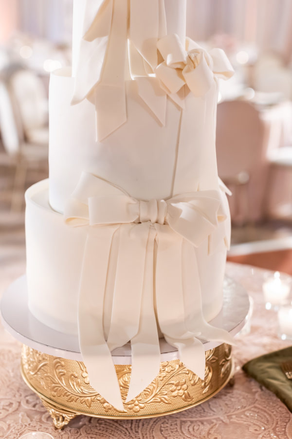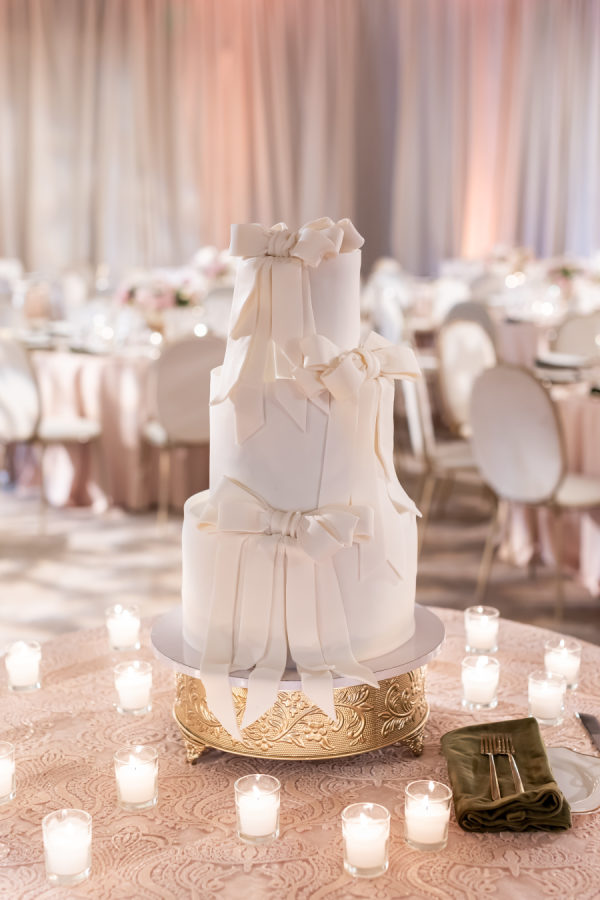 [field title=”Wedding Cake”]The couple’s wedding cake dripped with fondant bows, adding a luxurious touch to the candlelit atmosphere.[/field]