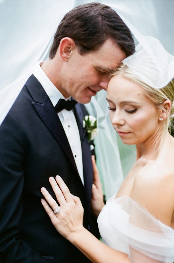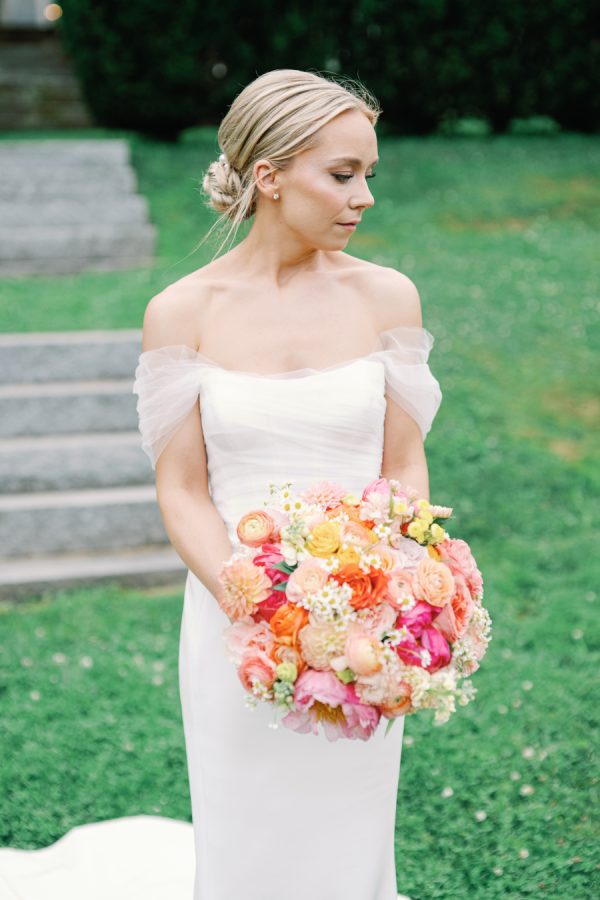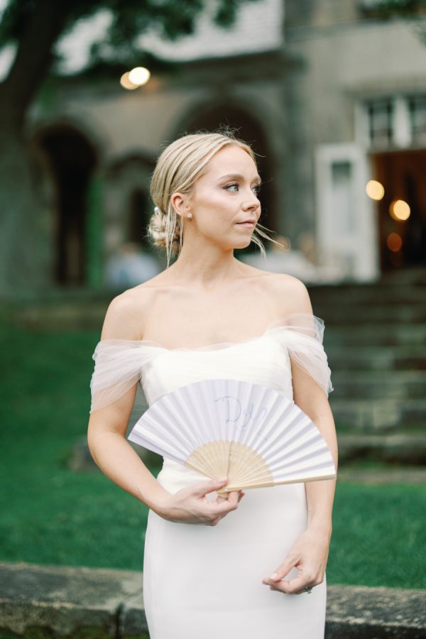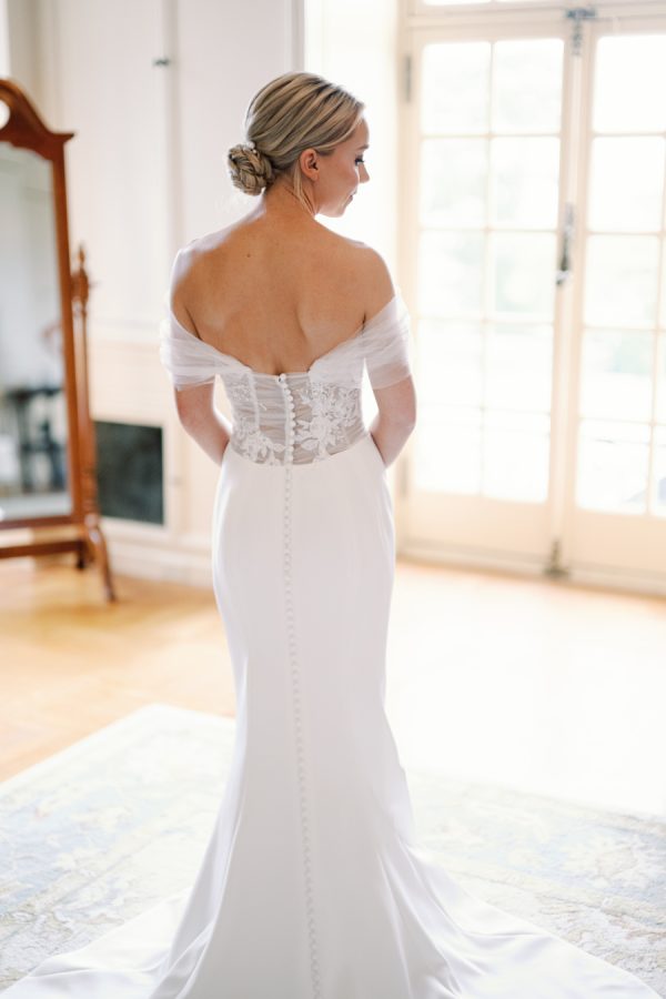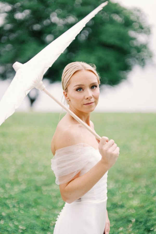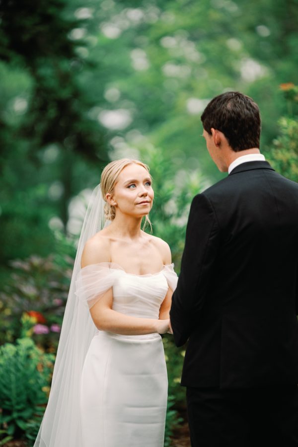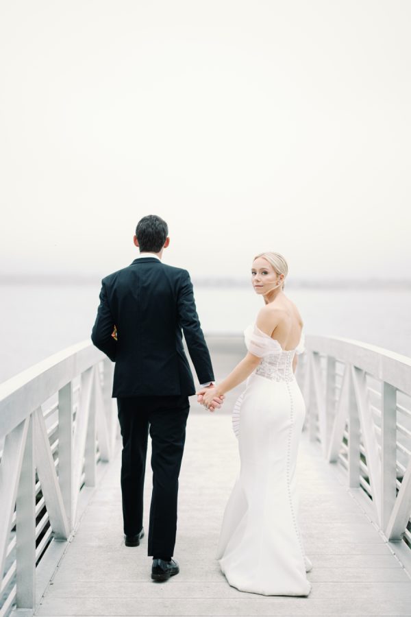 Dylan wore a gown by Ines Di Santo with a balance of simplicity and detail, as a draped tulle covered the corseted bodice, layering with the illusion lace back and off-the-shoulder tulle sleeves. Dylan captured memorable photos in the gardens while holding parasols with her bridesmaids, and the couple stole away for intimate dockside moments.