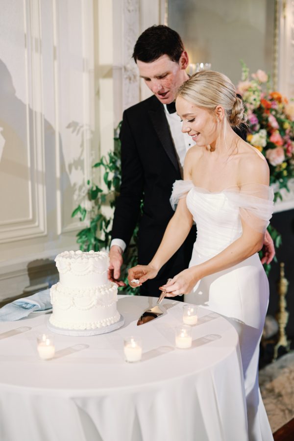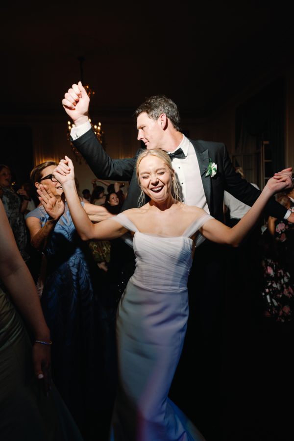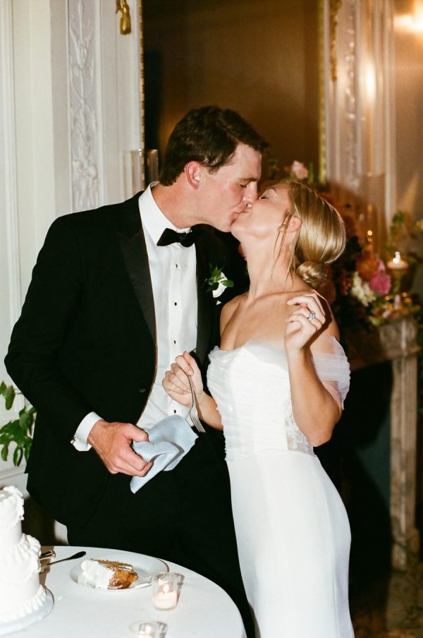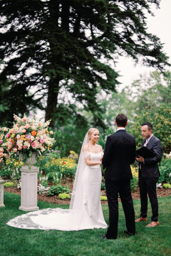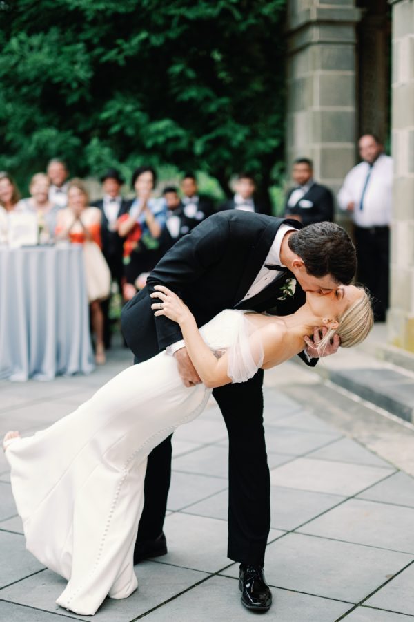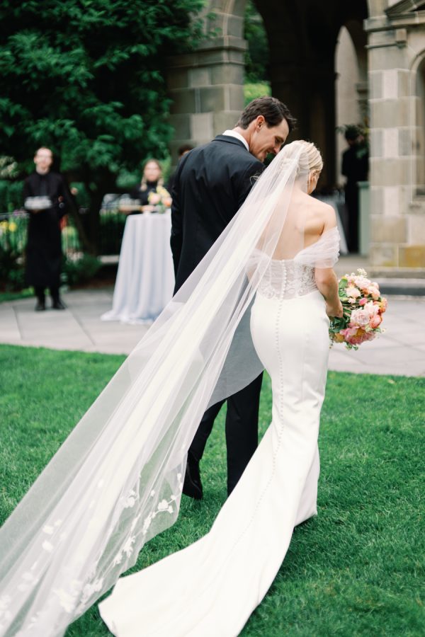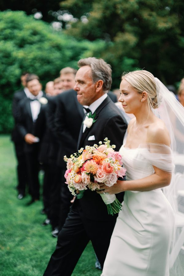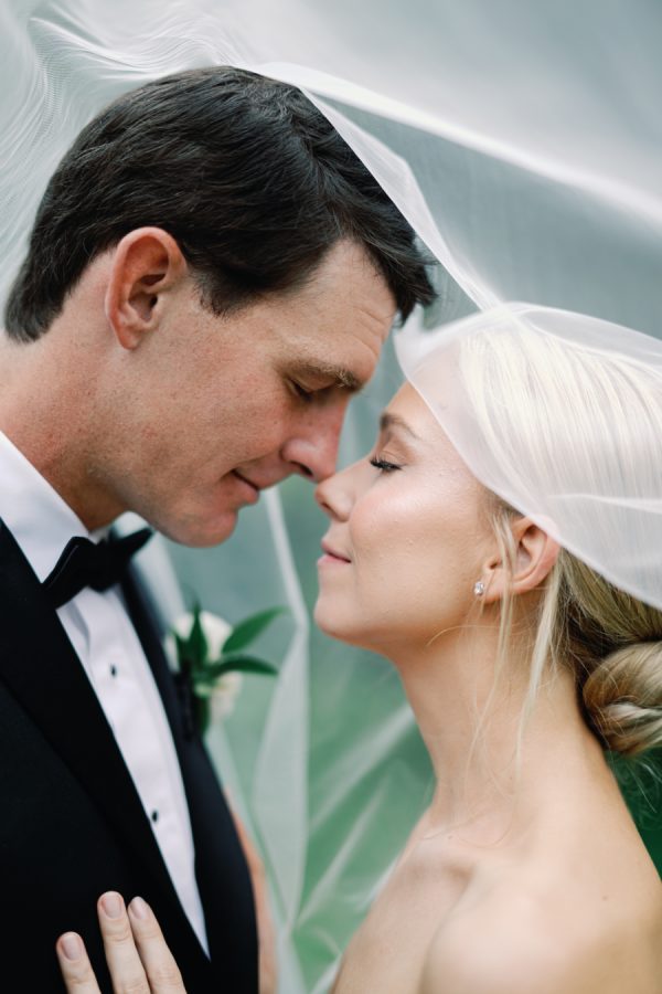 Dylan wore a gown by Ines Di Santo with a balance of simplicity and detail, as a draped tulle covered the corseted bodice, layering with the illusion lace back and off-the-shoulder tulle sleeves. Dylan captured memorable photos in the gardens while holding parasols with her bridesmaids, and the couple stole away for intimate dockside moments.