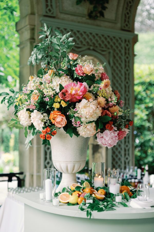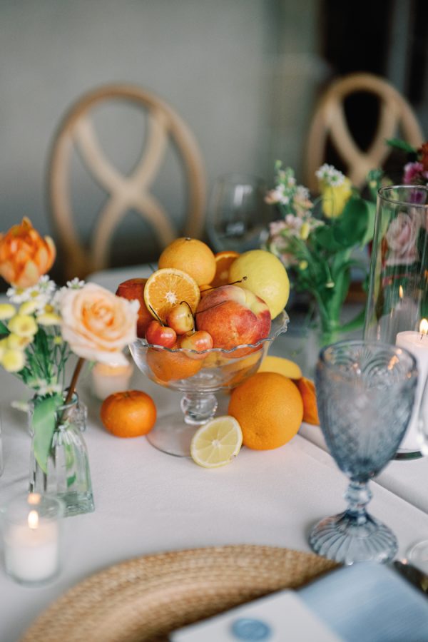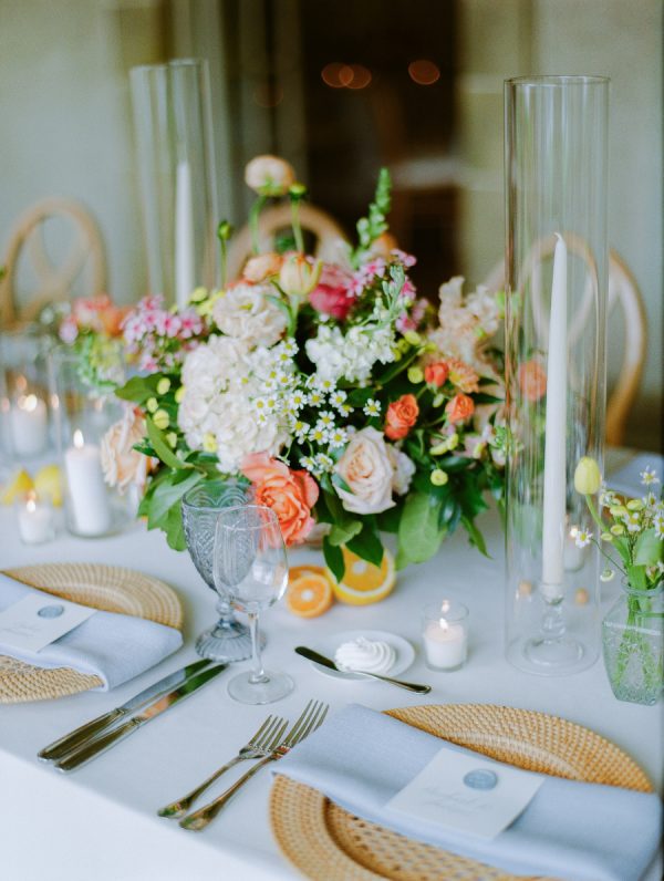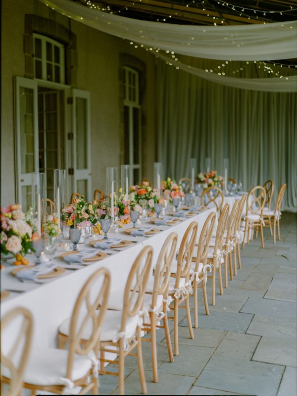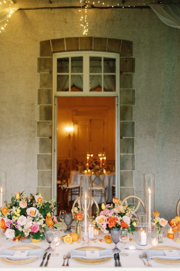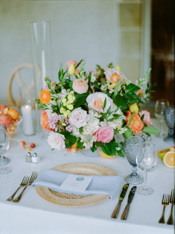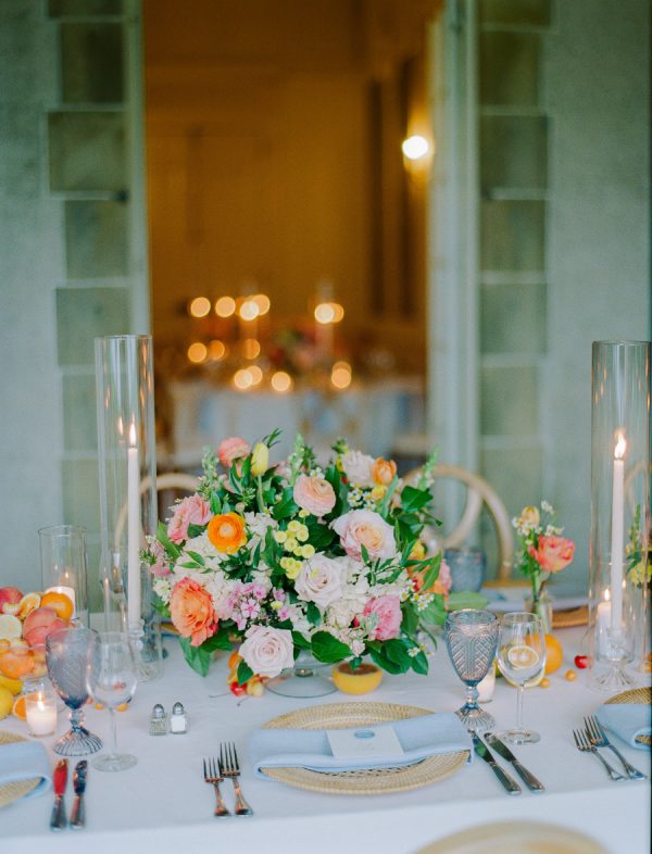 They selected a joyfully bright color palette as a celebration of the start of their married life, as well as the fifteen years they’ve spent together. The florals expressed this with a soft citrus story of pinks, corals, and yellows. The outdoor garden ceremony was adorned with fresh bouquets in stone planters at the altar. At each guest’s seat rested a hand-painted white fan with the couple’s initials and wedding date. Embracing the French Chateau style, the reception included colorful glassware, toile-printed details, calligraphy, and fresh fruit surrounding the centerpieces.
