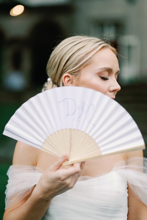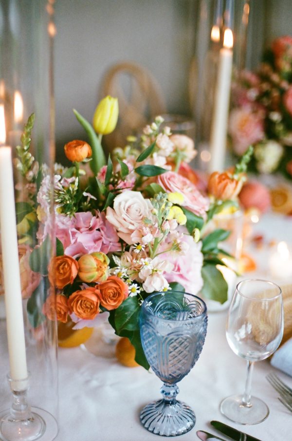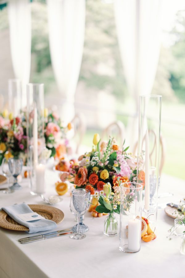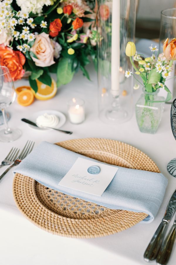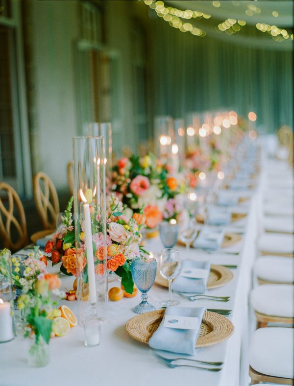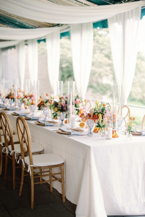 They selected a joyfully bright color palette as a celebration of the start of their married life, as well as the fifteen years they’ve spent together. The florals expressed this with a soft citrus story of pinks, corals, and yellows. The outdoor garden ceremony was adorned with fresh bouquets in stone planters at the altar. At each guest’s seat rested a hand-painted white fan with the couple’s initials and wedding date. Embracing the French Chateau style, the reception included colorful glassware, toile-printed details, calligraphy, and fresh fruit surrounding the centerpieces.