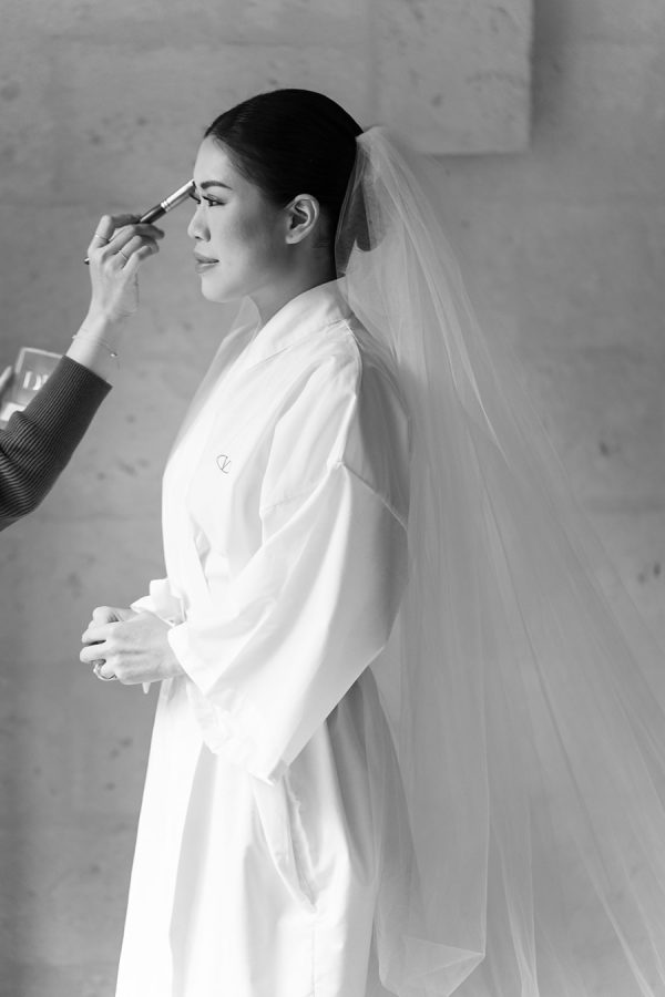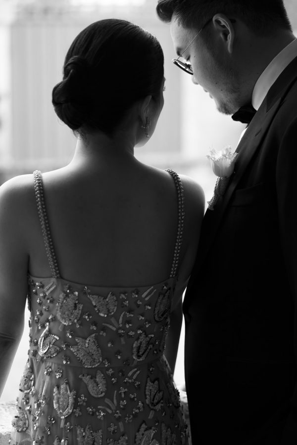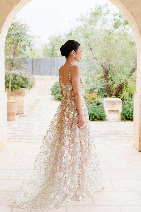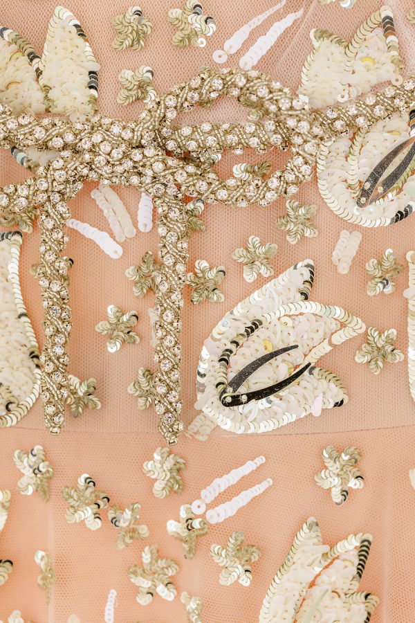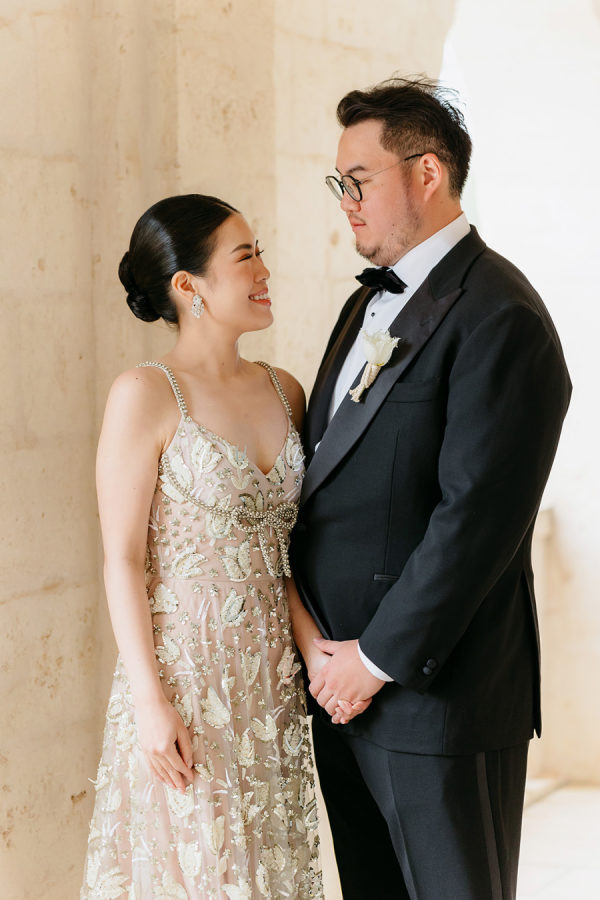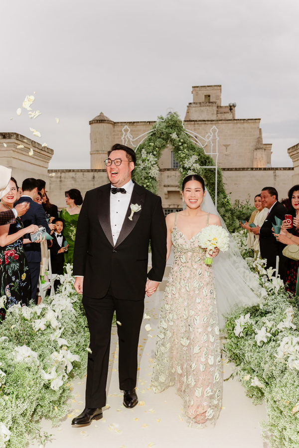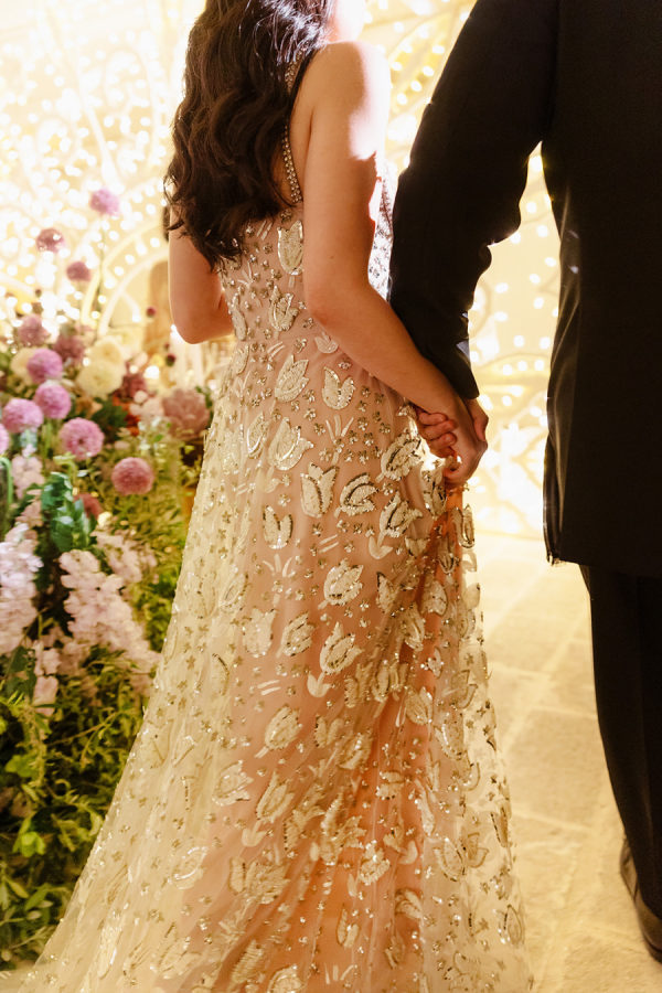 The bride’s custom Valentino gown is the stuff dreams are made of. It was a delicate A-line gown, made of beaded lace in an abstract floral motif with metallic accents. The light peach lining added a warm and unexpected surprise to the ethereal ensemble.