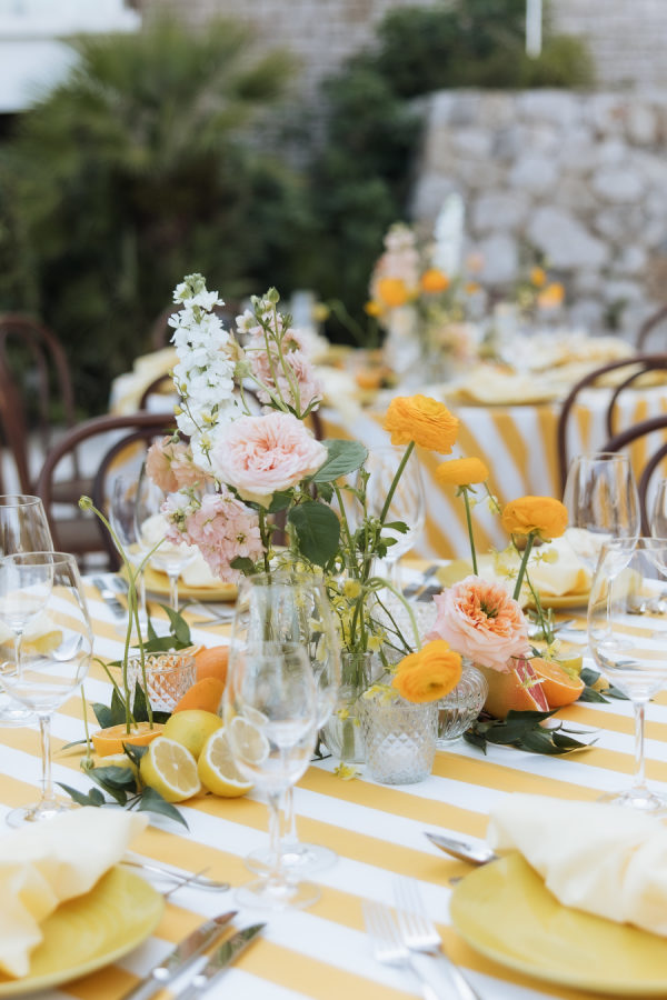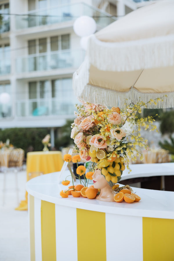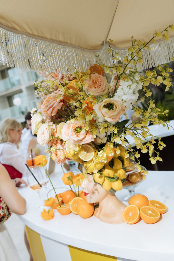 The night before the wedding, we had a white party on the hotel terrace at Amfora. For decor, we incorporated fresh citrus fruits for the centerpieces, arranged with vibrant orange florals as a departure from the softer pink palette of the actual wedding day. We had a gelato cart, spritz stand, watercolor portraitist, and live music to enjoy on Friday night in Hvar.