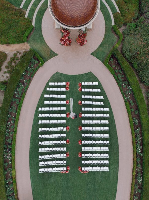 Through the planning, the couple focused on creating a fun guest experience, with each night’s food, fashion, and decor tailored to different themes. The weekend began with a Chinese-style banquet at Natasha’s hometown dim sum restaurant, J Zhou. Friday night’s Pasta Party featured Pelican Hill’s Italian villa architecture and homemade pasta, with a color palette of greens, lavender, and yellow, and flower arrangements including vegetables and a fresh mozzarella pulling station. The couple hosted a dessert and dancing afterparty for a fun night out in Laguna Beach at local watering hole Mozambique.