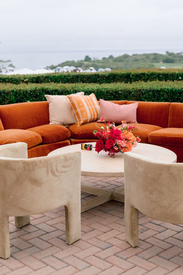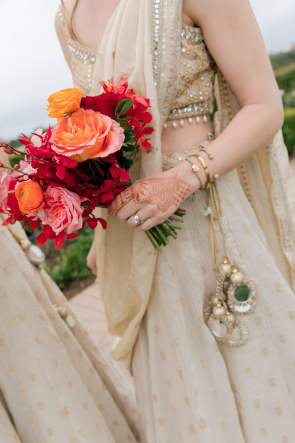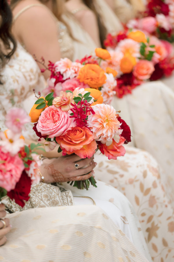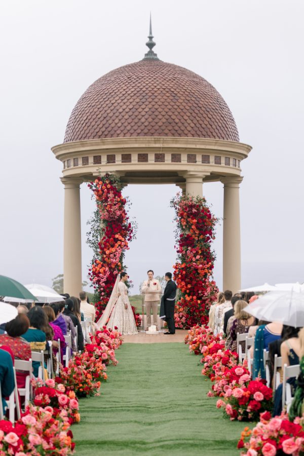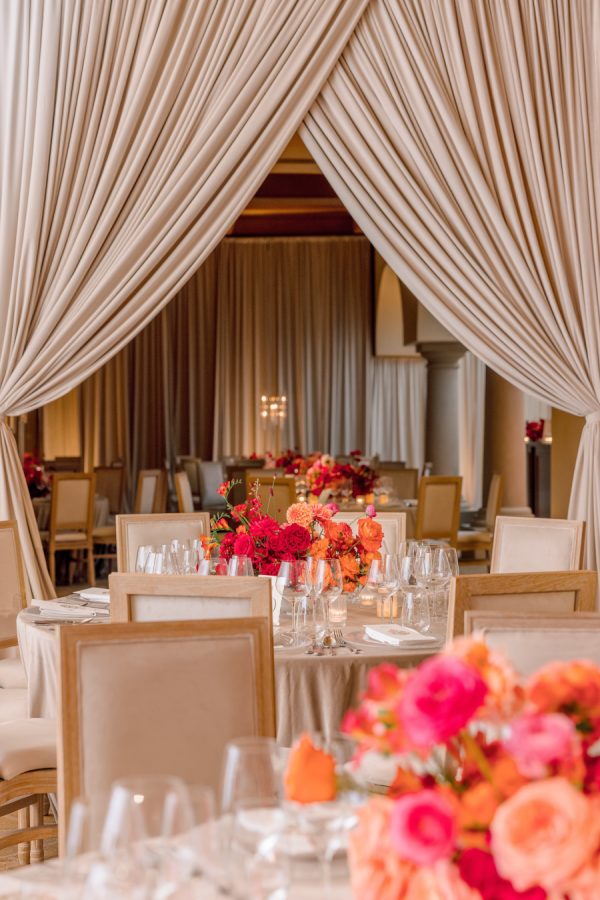 For the wedding colors, Natasha wanted to add some vibrant color to the Southern California resort feel of Pelican Hill. The color palette of reds, oranges, and pinks blended traditional South Asian richness with modern sophistication. The colors were designed to become darker throughout the evening, with a red floral ceiling installation above the indoor dance floor.