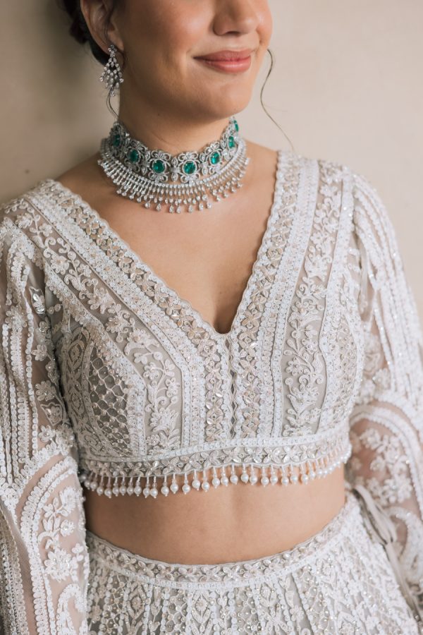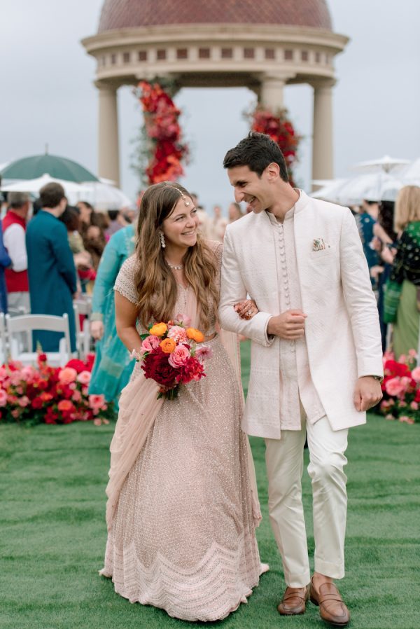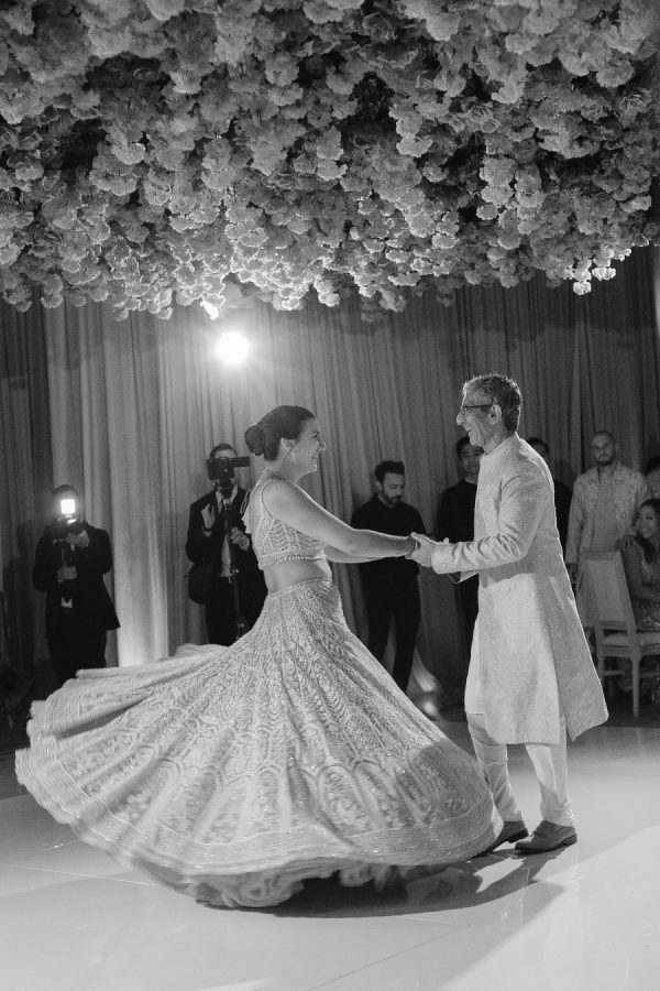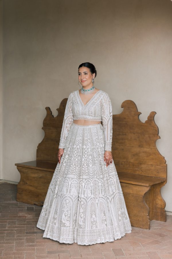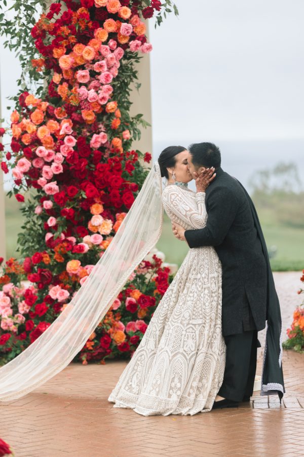 Natasha and Brian chose a timeless black and white palette, echoing Western wedding traditions, while embracing the elegance of classic Indian silhouettes. Natasha wore a qipao from Taiwan for Thursday and then a Rachel Gilbert one-shoulder dress for the Friday Pasta Party and afterparty. She worked with OC based stylist Lesley Brickman to put together this outfit. Natasha worked with Kynah LA on her reception look and wore a custom ivory Dori lehenga by designer Seema Gujral. She wore a long-sleeved blouse with a western-style veil for the ceremony and changed into a sleeveless blouse for dancing to create two looks with one lehenga.