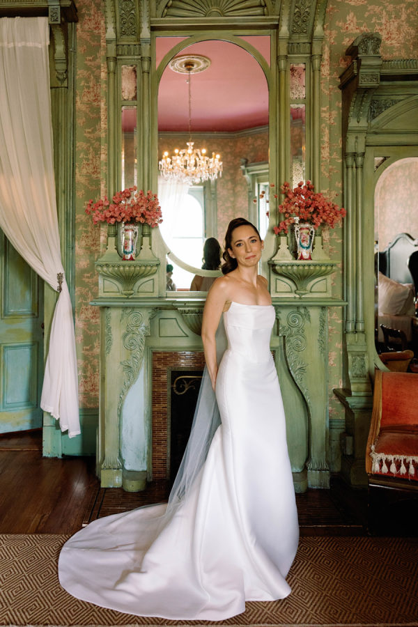 With friends from all walks of life, Skylar wanted her bridesmaids to feel comfortable and confident in what they wore. Each chose a silk dress in a shade of spring green, ranging from soft sage to deep moss, allowing their individual personalities to come through while still feeling cohesive. The natural palette beautifully echoed the lush greenery of The Columns’ courtyard.