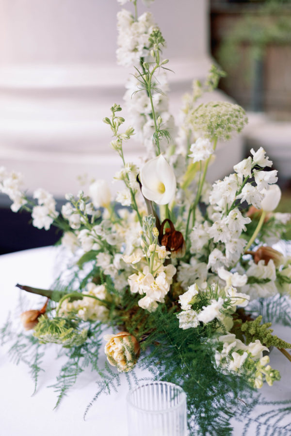Skylar’s mother carried calla lilies at her own wedding, and incorporating them was a meaningful nod to her. The florals leaned into the lush greenery of The Columns’ courtyard, with spring greens, ivory, and soft local blooms accented by glowing candlelight as the evening transitioned to night. The design was simple yet romantic, letting the venue’s beauty take center stage.