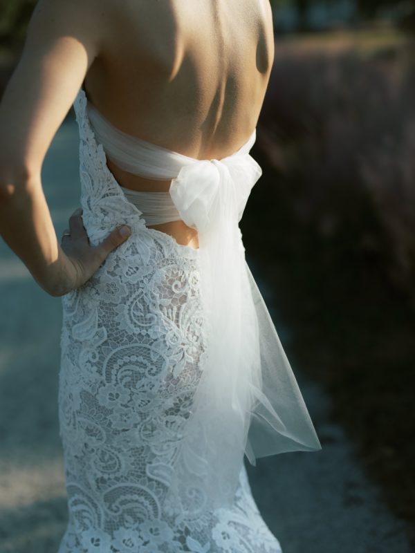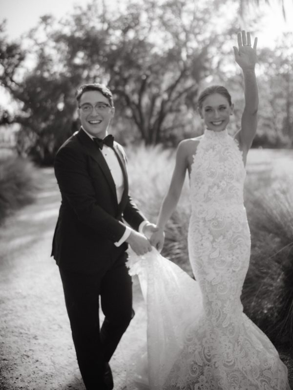 For her bridal look, Rebekah chose a high-neck halter gown by Oscar de la Renta — a textural, dramatic silhouette with timeless sophistication. Her unique after-party look featured a hand-bedazzled white Mets jersey to surprise her new husband.
