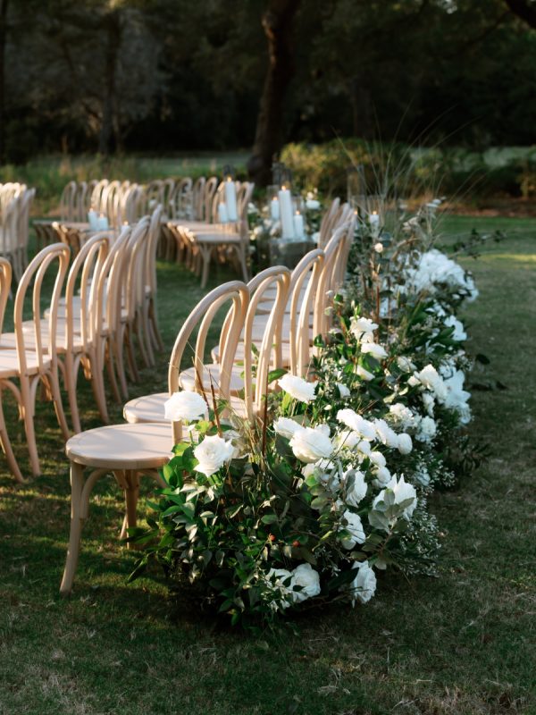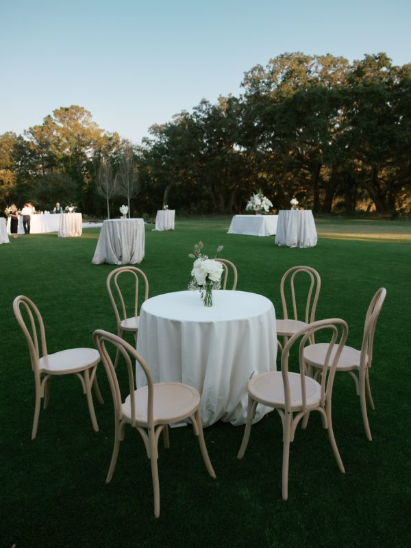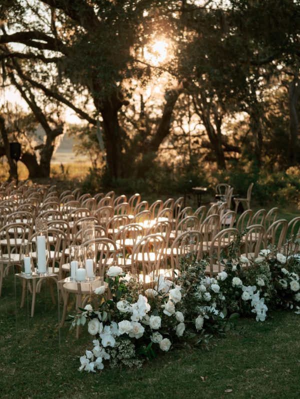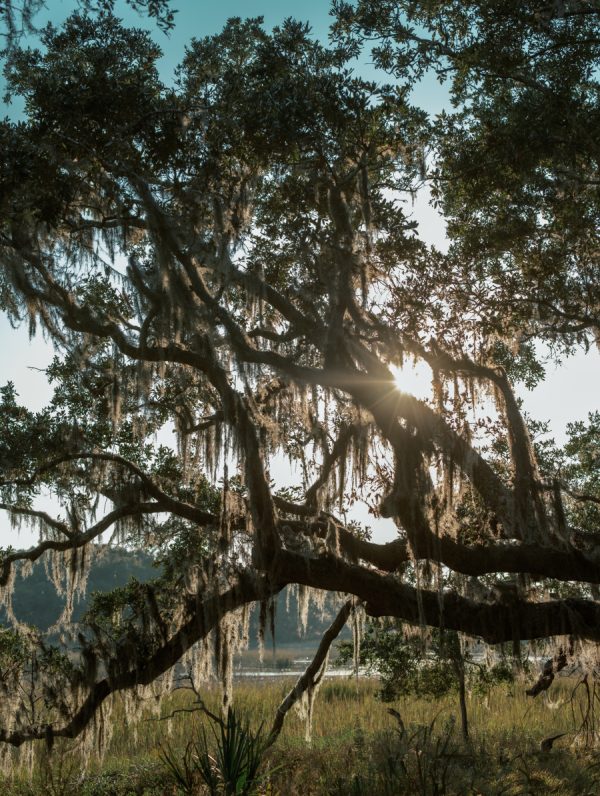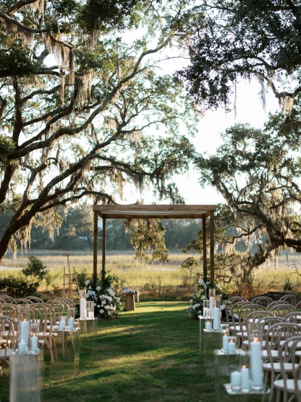 The ceremony unfolded along a wooden platform through the trees, where candles lined the path and branches arched overhead, opening to views of the river and grasslands. As the sun dipped below the horizon, candlelight softly illuminated the gathering. Subtle nods to history appeared throughout their details, from custom logos to designs inspired by South Carolina’s colonial currency.