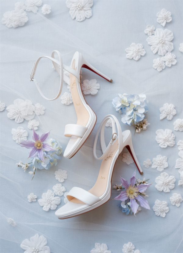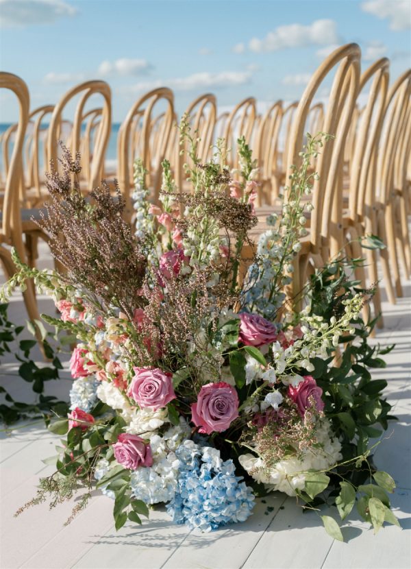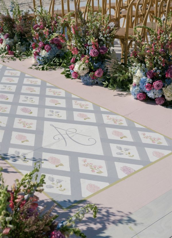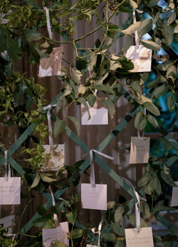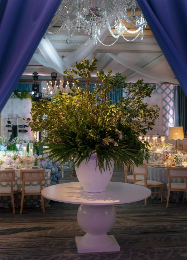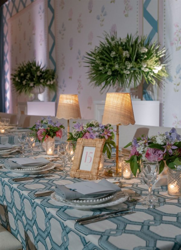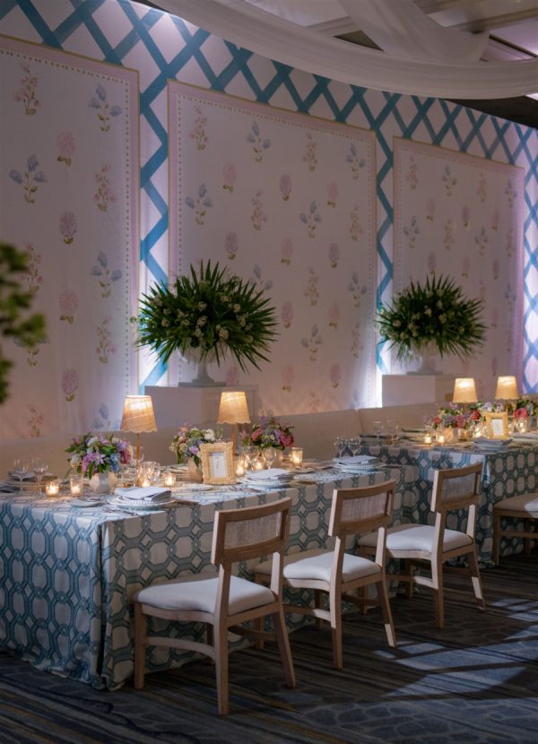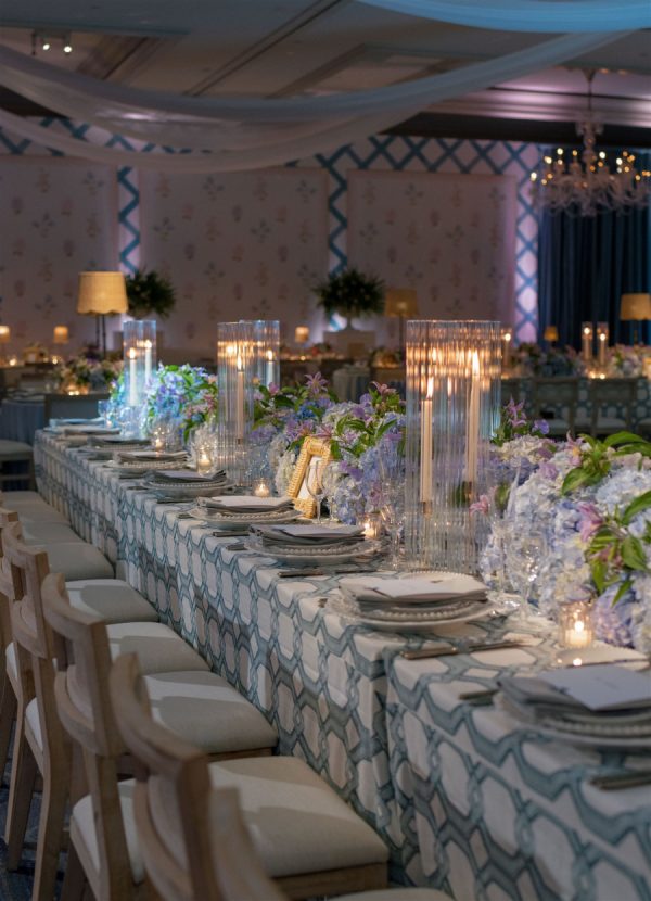 The wedding design encompassed a palette of airy blues, fresh greens, and timeless whites with the addition of blush and lavender tones brought in through the floral and stationery elements. The bride carried a classic hand-tied bouquet of creamy white ranunculus and garden roses, accented with textural greenery, while her bridesmaids’ all-white blooms beautifully complemented their ocean-hued gowns. In the reception space, guests were welcomed into a ballroom transformed by cascading drapery, candlelit tablescapes, and grand floral arrangements that framed the room. Overhead, a custom lattice structure adorned with greenery and blooms floated above the dance floor, creating a striking focal point that set the tone for an unforgettable evening. “During the wedding planning process, I had my heart set on creating a never before seen ceiling installation in our Reception space. I wanted something that was one-of-a-kind and had never been done before. Anna and 50Fifty worked together to create the floral ceiling installation over the dancefloor, which truly was the focal point of the Reception space.”