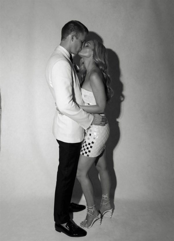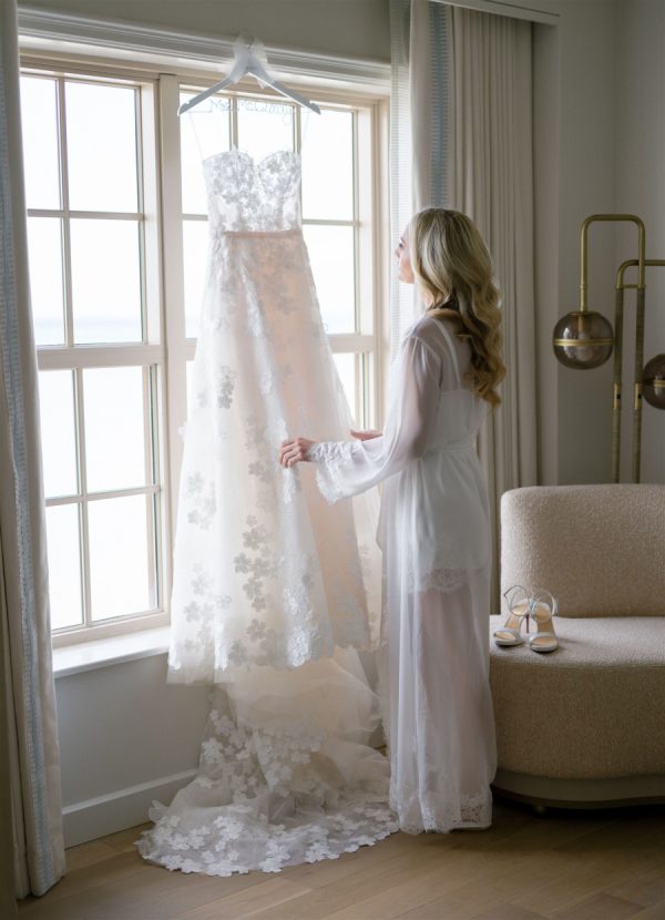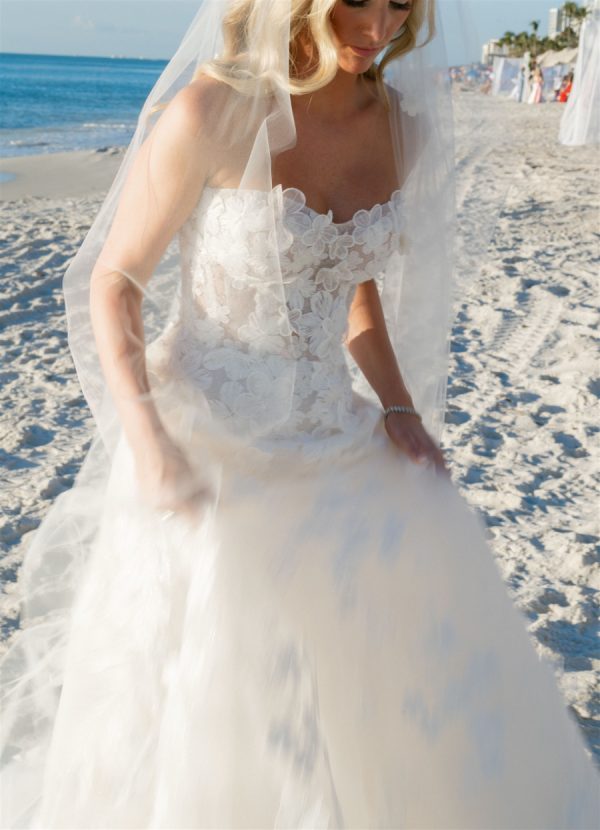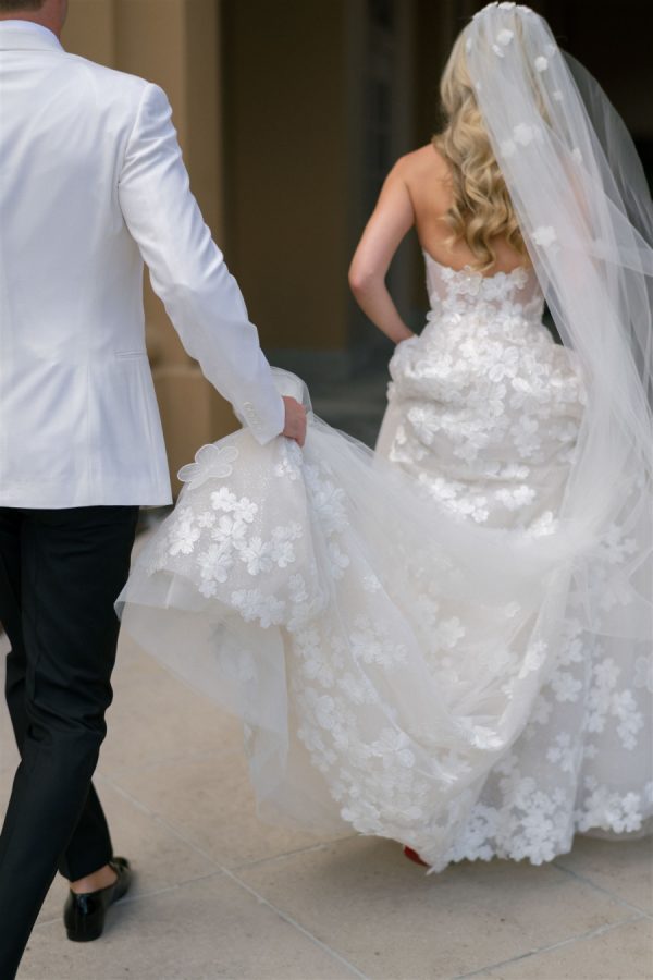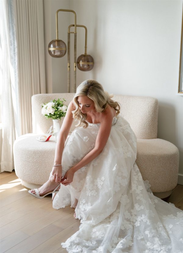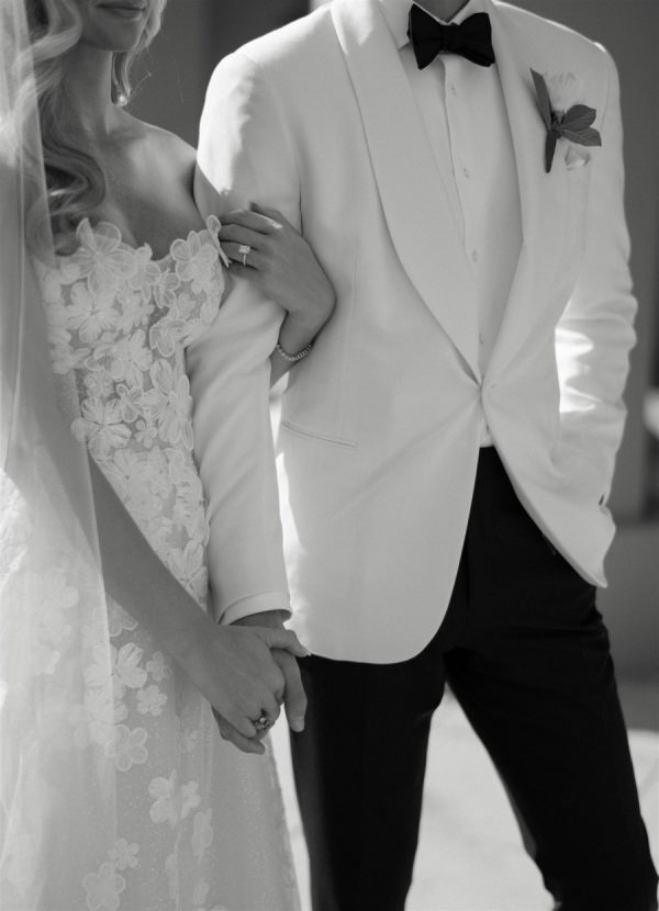 The bride wore a custom strapless A-Line Mira Zwillinger Wedding gown with Christian Louboutin heels. The second look she wore an ILA mini dress with Rene Caovilla heels. Both looks were complemented by a diamond necklace that the groom designed for her as a wedding present. “The Aquamarine ring I wore throughout our wedding day is a family ring on the groom’s side that has now been passed down through four generations of women. The ring was originally gifted to the grooms Great Grandmother when his Grandfather, “Paps, was born. The stone is an Aquamarine, the groom’s Grandfather’s birthstone. The groom’s mother (my now mother-in-law) gave it to me to wear on our wedding day, since I am the next woman to carry on the family name to future generations.”