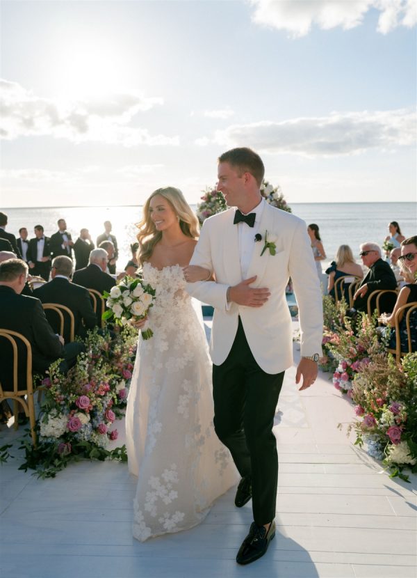 The ceremony unfolded with the wedding party processing down the aisle to Bach’s “Jesu, Joy of Man’s Desiring.” Moments later, the bride made her entrance to Pachelbel’s “Canon in D,” a classic choice that set a romantic and reverent tone. Following their heartfelt vows, the newlyweds recessed joyfully to Natalie Cole’s “This Will Be,” a celebratory start to the festivities ahead. As the evening continued, The Headliners band kept the dance floor full, ensuring guests celebrated late into the night with energy, joy, and unforgettable music.