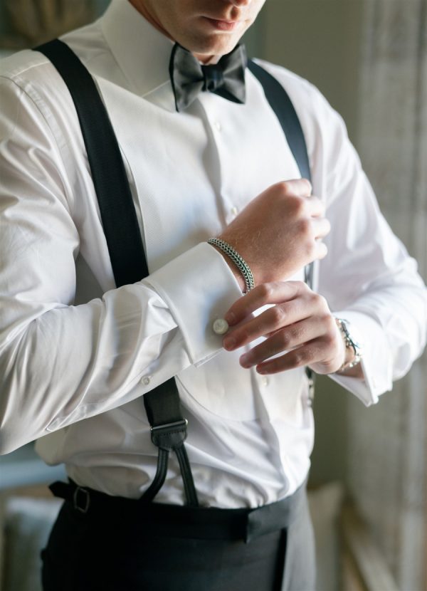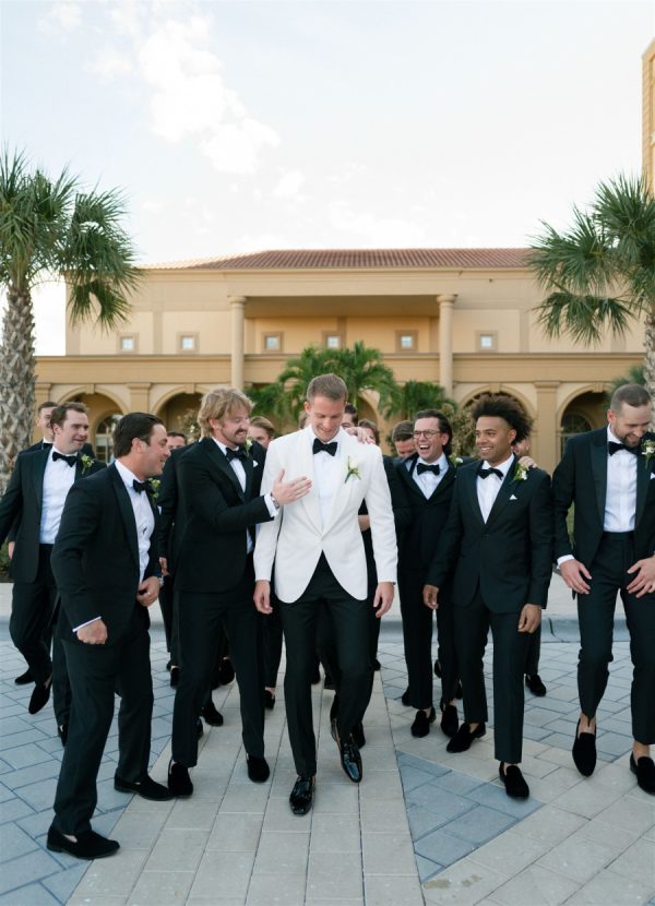 The groom wore a custom purple label tuxedo by Ralph Lauren, with Christian Louboutin shoes. He complemented his look with a Rolex watch. His groomsmen were outfitted in The Black Tux rentals.