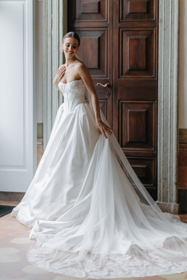 [field title=”Wedding Gown”]The bride chose a structured princess gown by Wona Concept, embodying modern elegance with clean lines and a timeless silhouette. The fabric offered just the right amount of volume and architectural presence, making it ideal for a bride seeking sophistication without excessive embellishment. Its contemporary cut allowed her to feel poised and confident throughout the day, from the ceremony to the lakeside portraits.[/field]